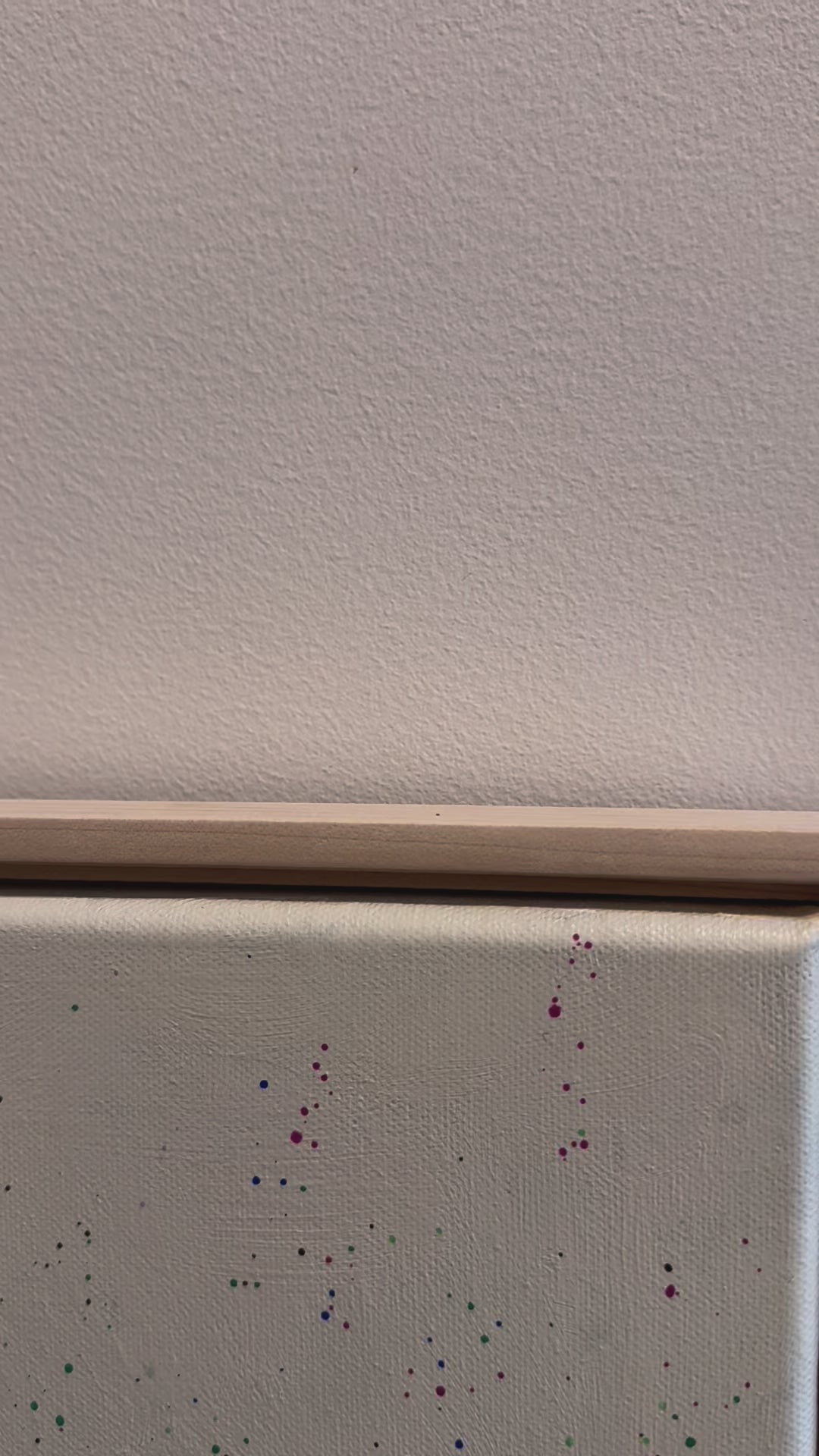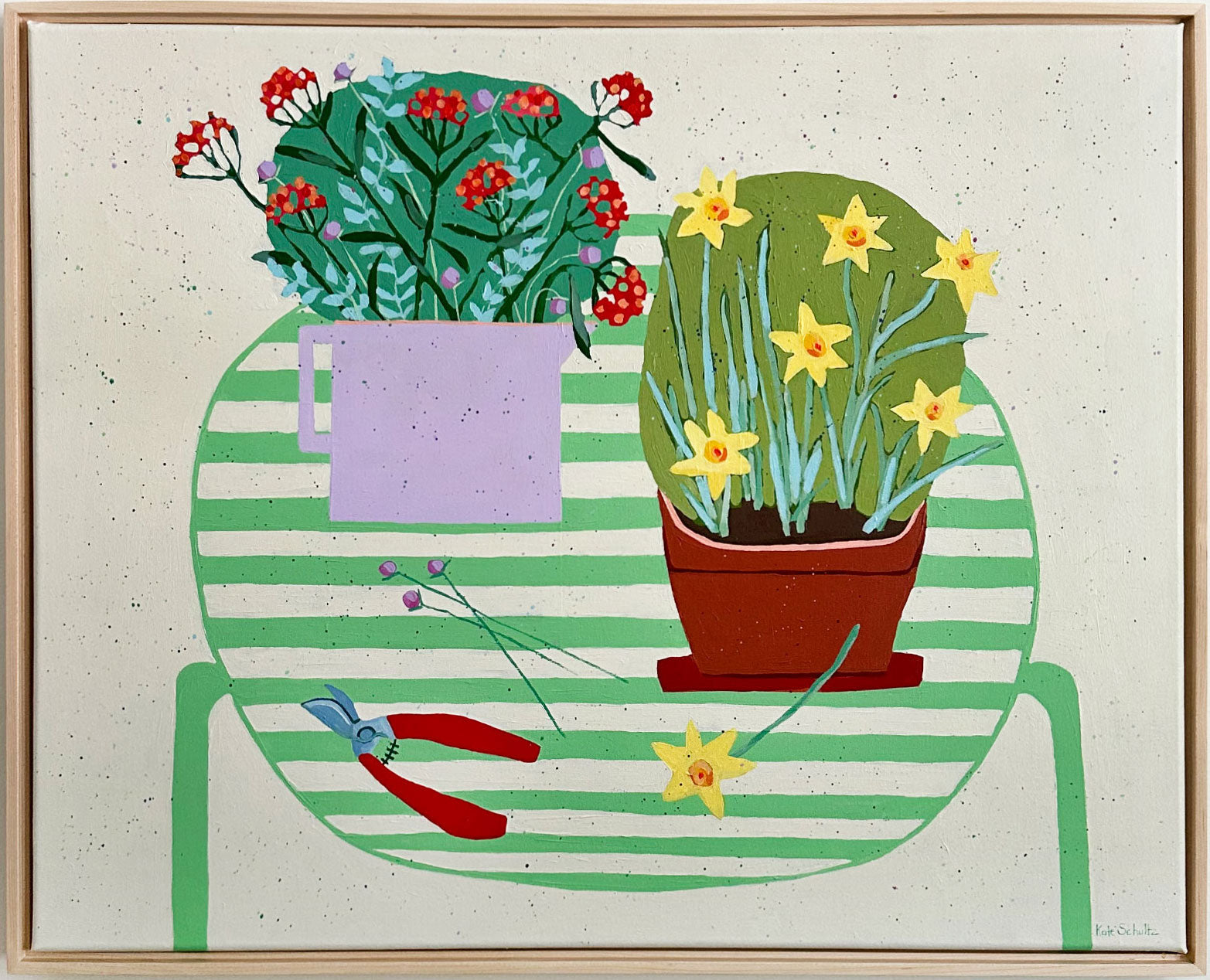 This artwork by Kate Schultz measures 24 x 30. Kate uses acrylic paint on canvas and this work is in a maple floater frame.