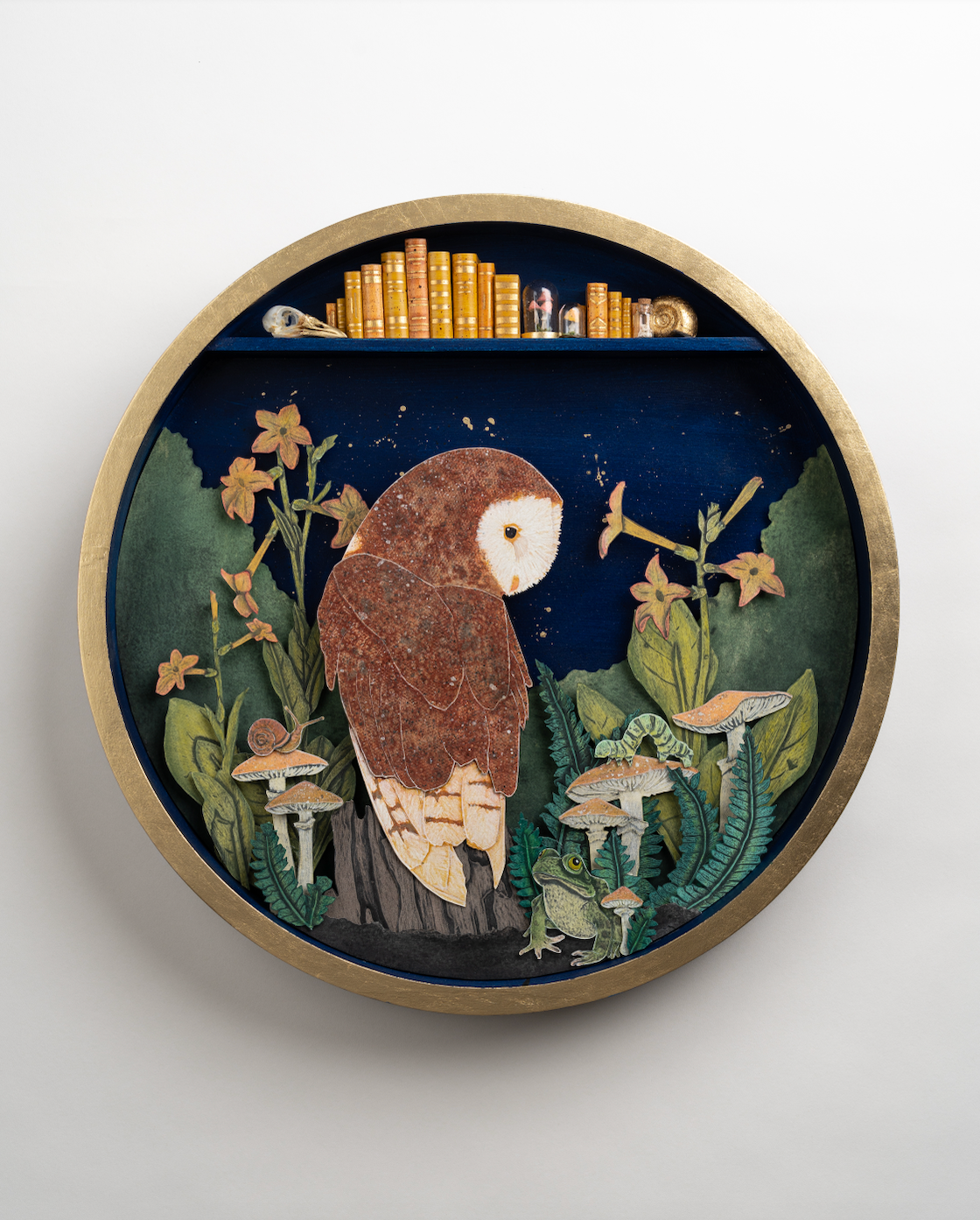 "My work is an exploration of the natural world. I use scraps of wood, paper, bone, and fabric and include both found and crafted specimens. Each art piece contains a variety of processes including collagraph printmaking, woodworking, and sculpting. There is a certain practicality and reflection to my work. I work with things that have died, but left a beautiful reminder of their existence (skulls, vertebrae, fossils, and insects). I am inspired by the sense of discovery of 18th and19th century natural history collections, and the preservation of reliquaries housed in the great cathedrals. As they do, my art invites a closer study of the earth around us." Bess