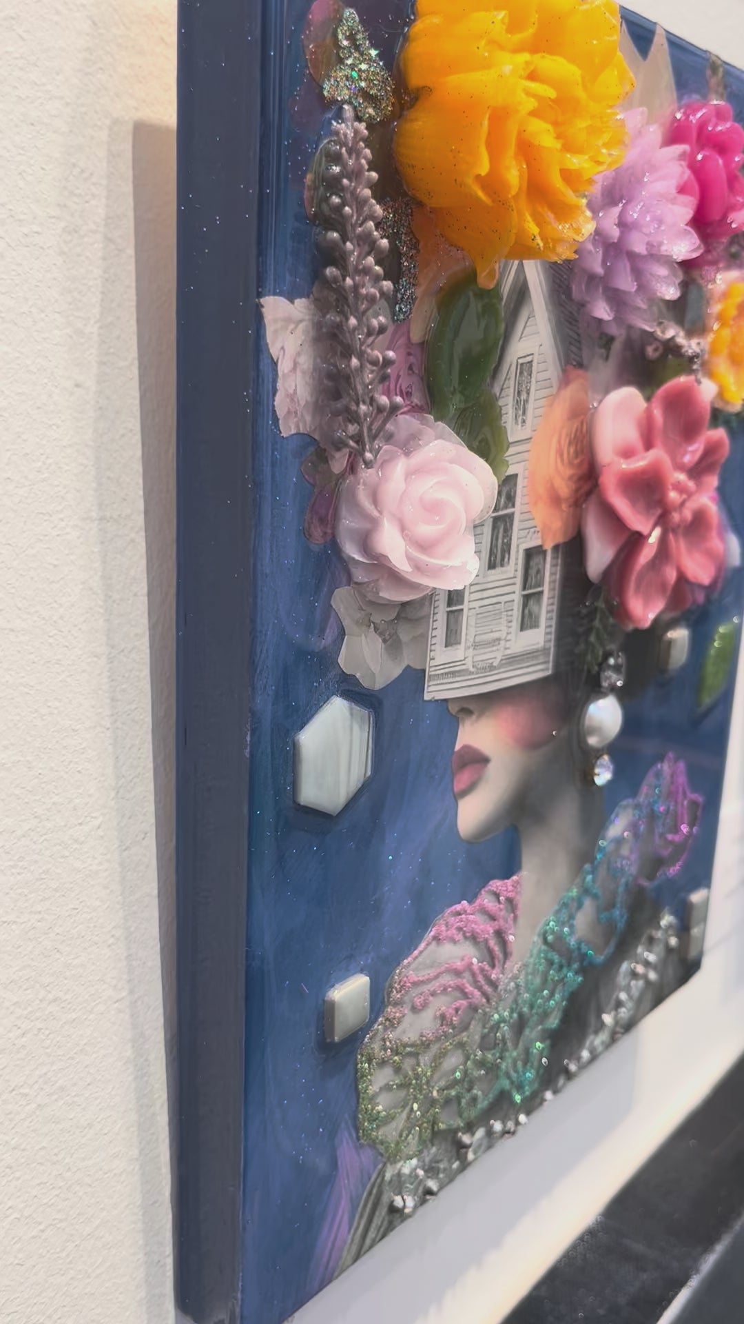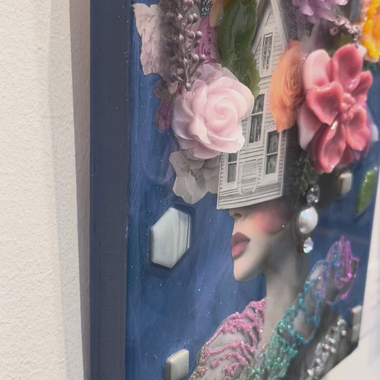 This artwork by Amy Shekhter measures 10" x 8". Amy merges digital design with layers of texture including: resin, glitter, paint, and crystals.