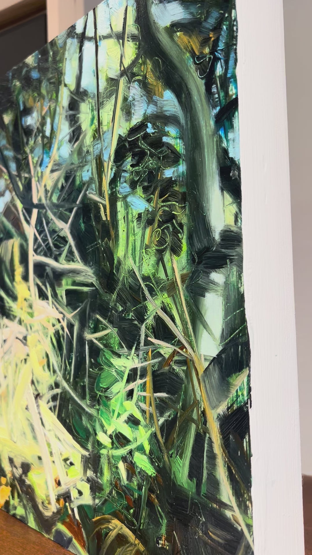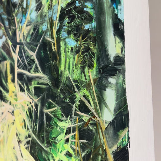 This 12 x 9 oil on panel painting by Laura Colomb features a vivid, layered brushstroke style that merges abstract shapes with rich, natural hues. Energetic swirls of pigment create depth and movement, capturing the lush essence of foliage and undergrowth.