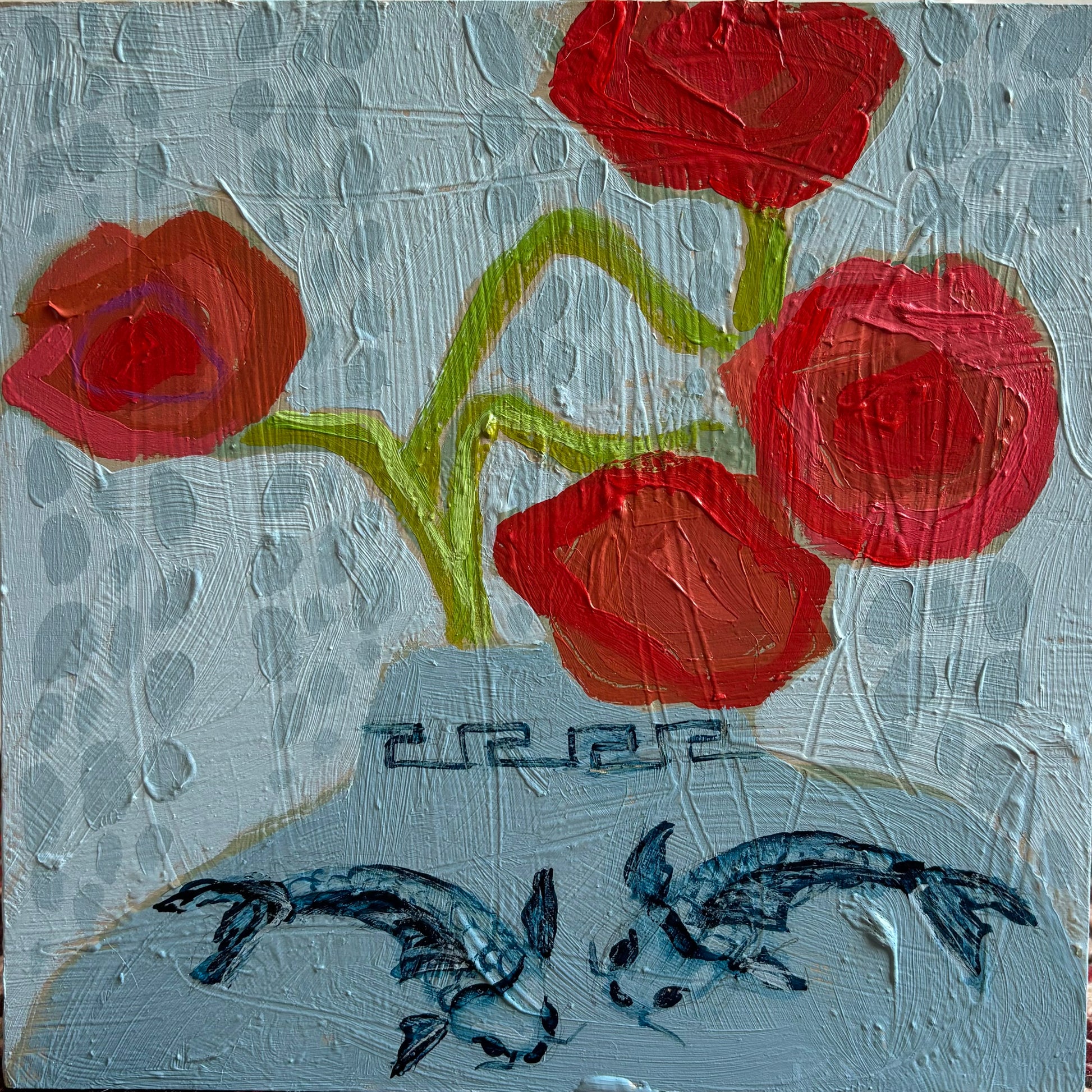 This Painting by Berkley Wooten is 8 x 8. Berkley uses acrylic and ink and uses palette knives, brushes, tools, and fingers to scratch and manipulate the wood panels.