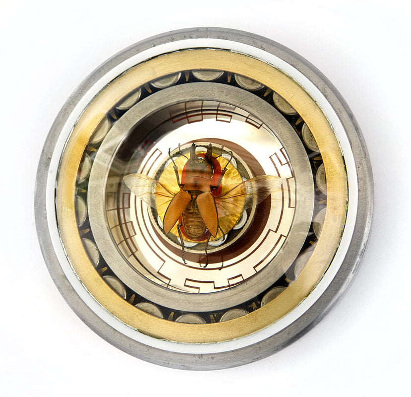 Suzanne Schmid’s pieces are preserved under a glass dome that she hand-blows in a hot glass studio. She uses a "cold connection" technique to build her pieces with nuts and bolts and machining parts. Her sculptures are modern-day reliquaries for the office and home.