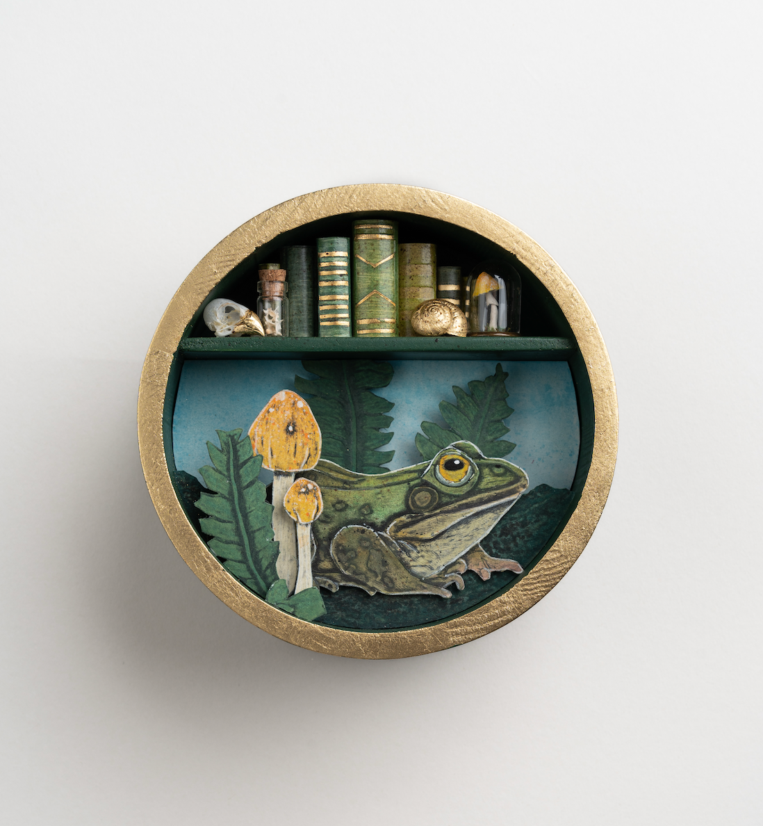 "My work is an exploration of the natural world. I use scraps of wood, paper, bone, and fabric and include both found and crafted specimens. Each art piece contains a variety of processes including collagraph printmaking, woodworking, and sculpting. There is a certain practicality and reflection to my work. I work with things that have died, but left a beautiful reminder of their existence (skulls, vertebrae, fossils, and insects). I am inspired by the sense of discovery of 18th and19th century natural history collections, and the preservation of reliquaries housed in the great cathedrals. As they do, my art invites a closer study of the earth around us." Bess