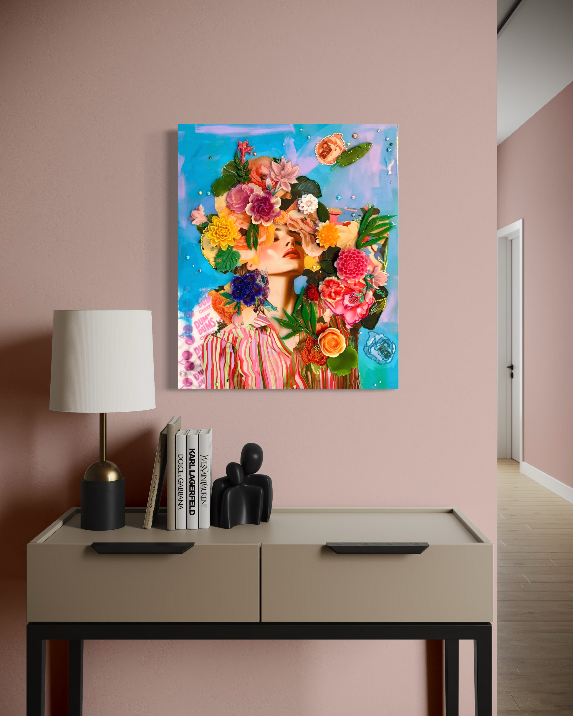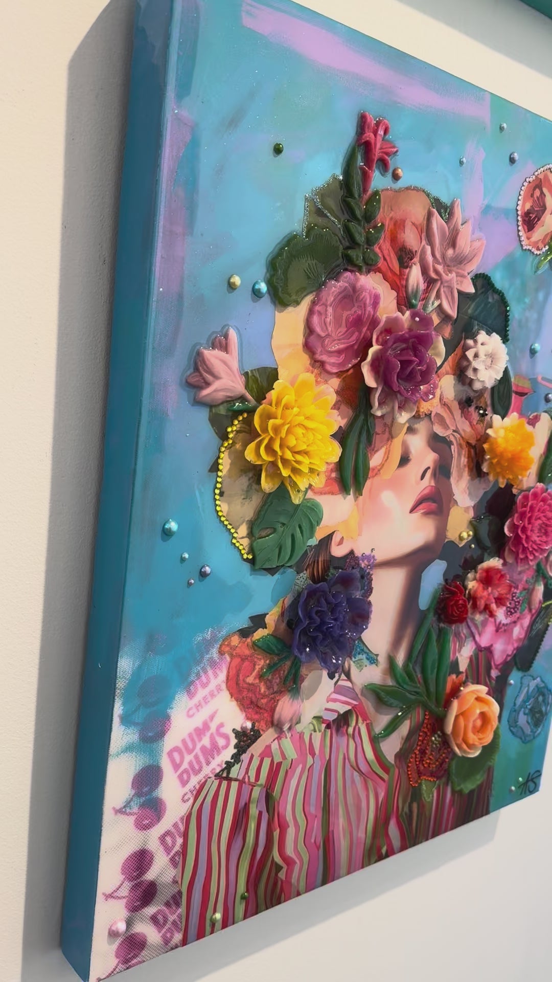 Amy Shekhter is a multi-disciplinary artist living in Florida. She spent the first 20 years of her life growing up in Alaska, which has many months of cold and darkness. This inspired her to use unconventional materials to create a space indoors filled with colorful art and interesting designs. After moving to Florida, she earned her Masters Degree in Art Education, and spent 8 years teaching public and private school students about art. Having missed the time to create her own work, she decided quit teaching to follow her passion and became a full-time artist. Guided by her fascination with different cultures, communities, and fashion, Shekhter merges digital design with various materials and textures. Layers of media, such as resin castings, plexiglass, beads and glass are carefully placed to give each artwork a three-dimensional appearance. Each figure is imagined from a distant memory or dream and inspired by the beauty of nature and growth, giving the viewer a sense of joy and wonder while also having them construct their own connection from the various visual elements.