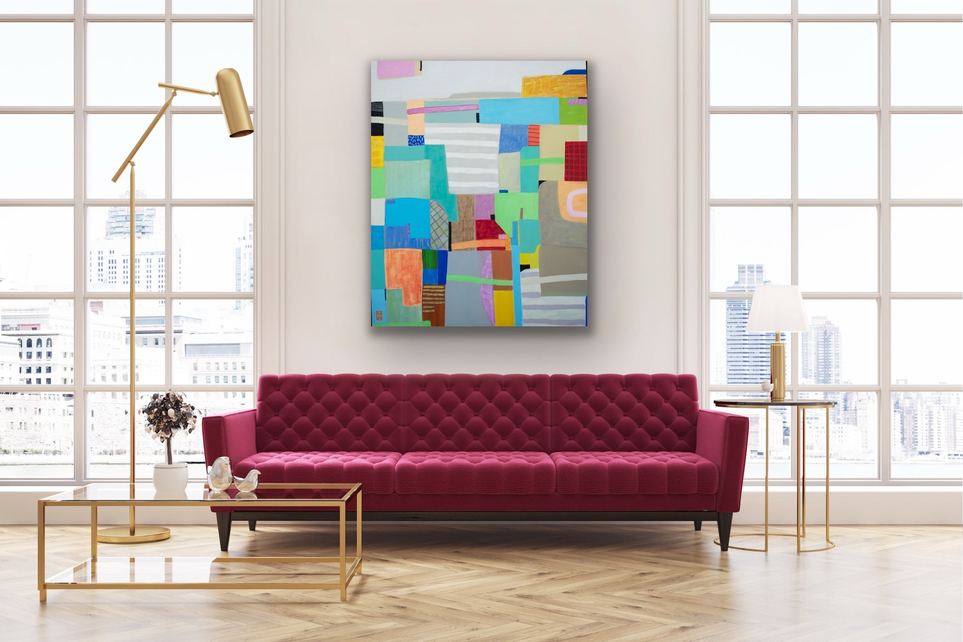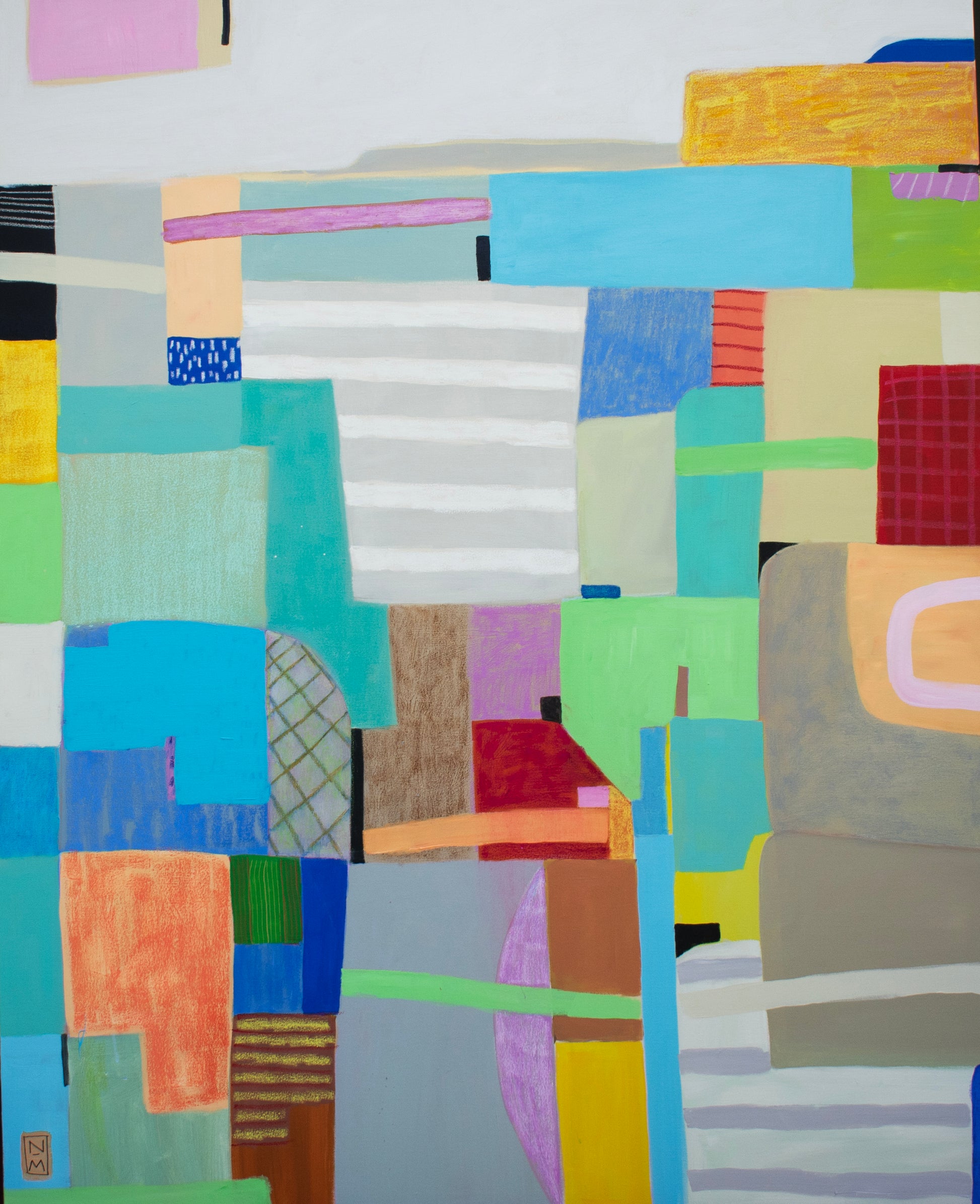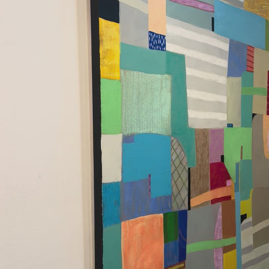 This piece by Nathaniel Mather measures 60"x 48". It incorporates stamps and paper which gives the painting a quality of age, travel and experience. The piece is made with water medium materials and is on canvas. This painting is part of the "Draw Near" collection.