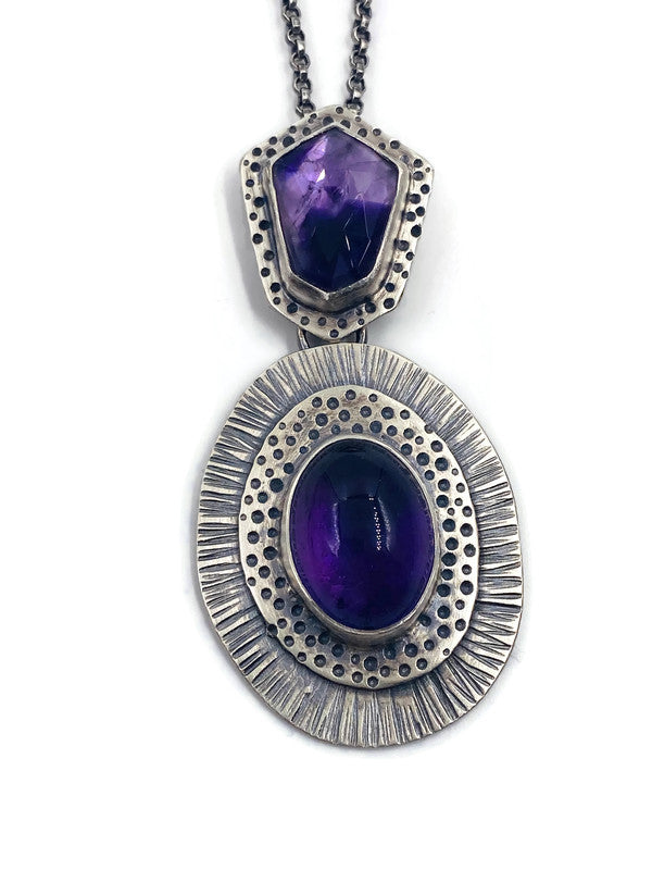 This necklace by Lisa Colby is hand wrought with sterling silver and oxidized to highlight the surface texture. The pendant includes a amethyst gem stones.