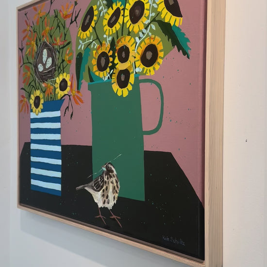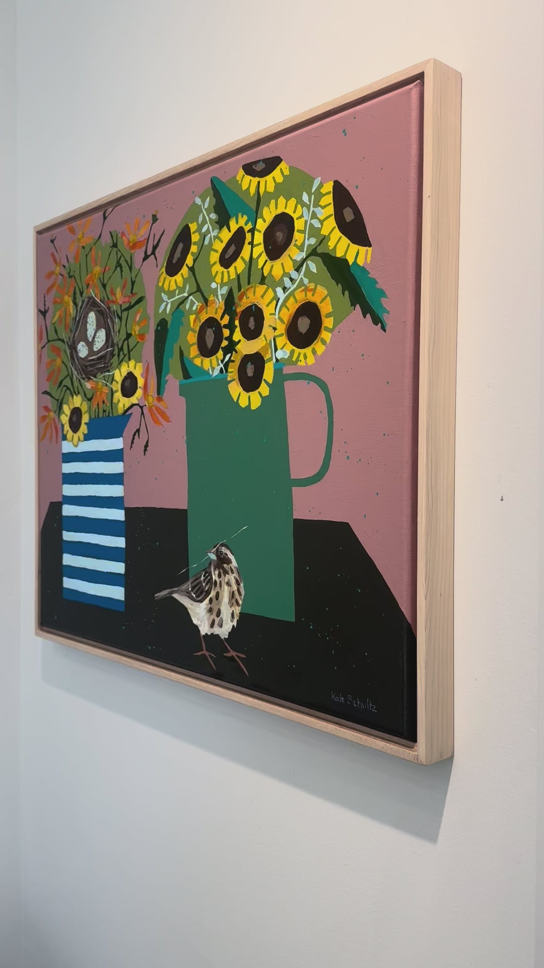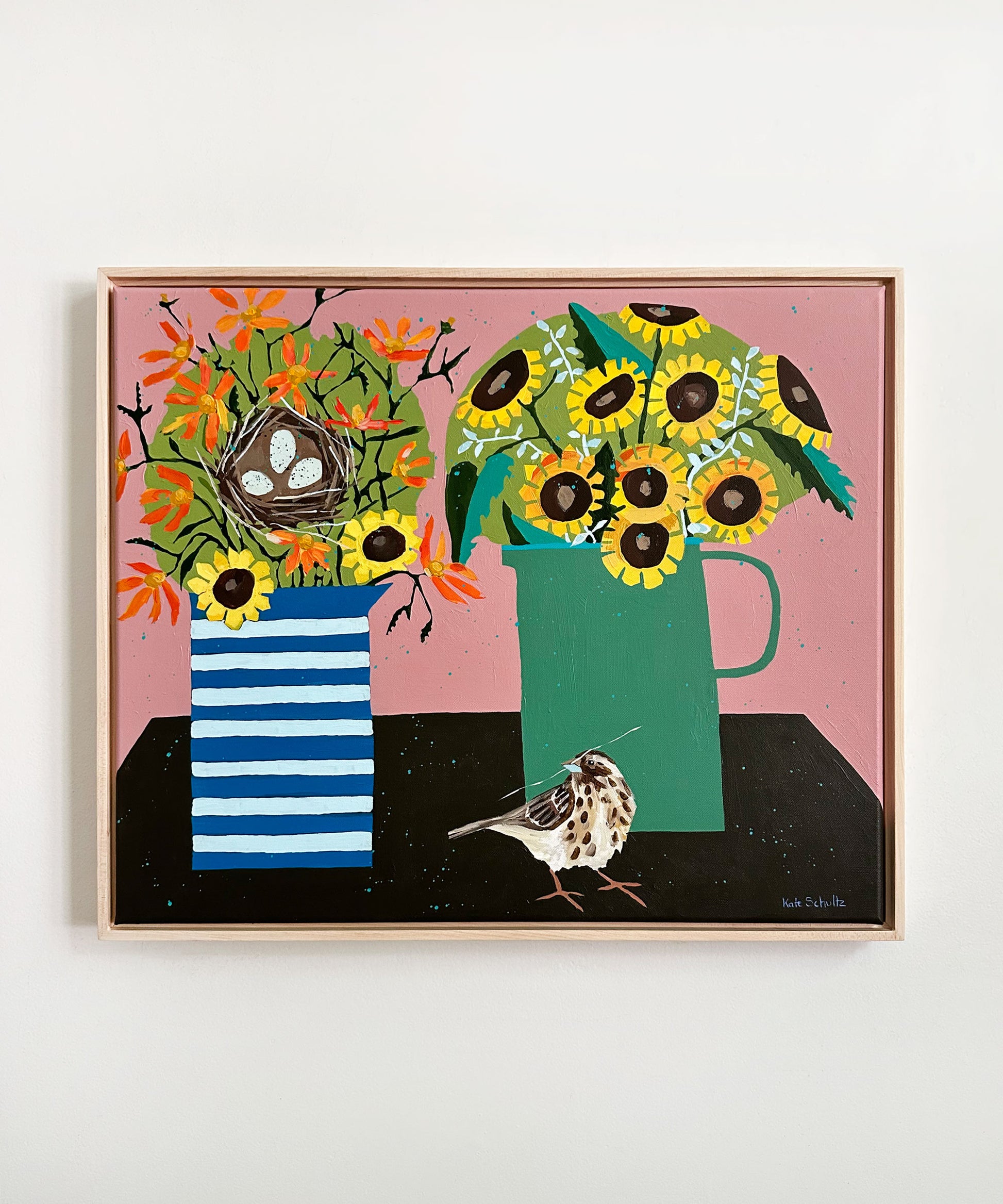 This artwork by Kate Schultz measures 20x24. Kate uses acrylic paint on canvas and this work is in a maple floater frame.