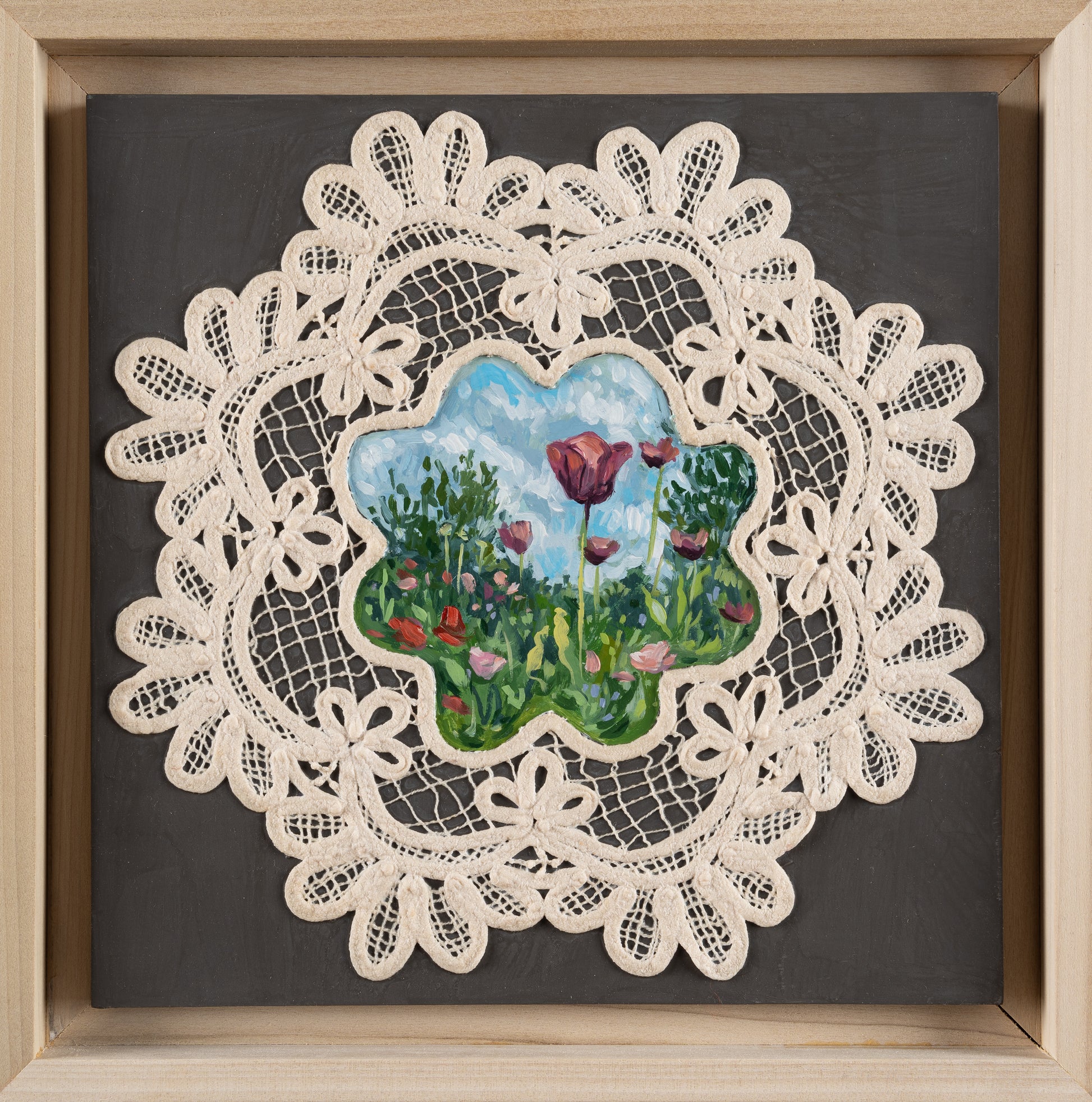 This Mixed Media Painting by Michelle Berg Radford is 11 x 11. This work is painted on a vintage doily.