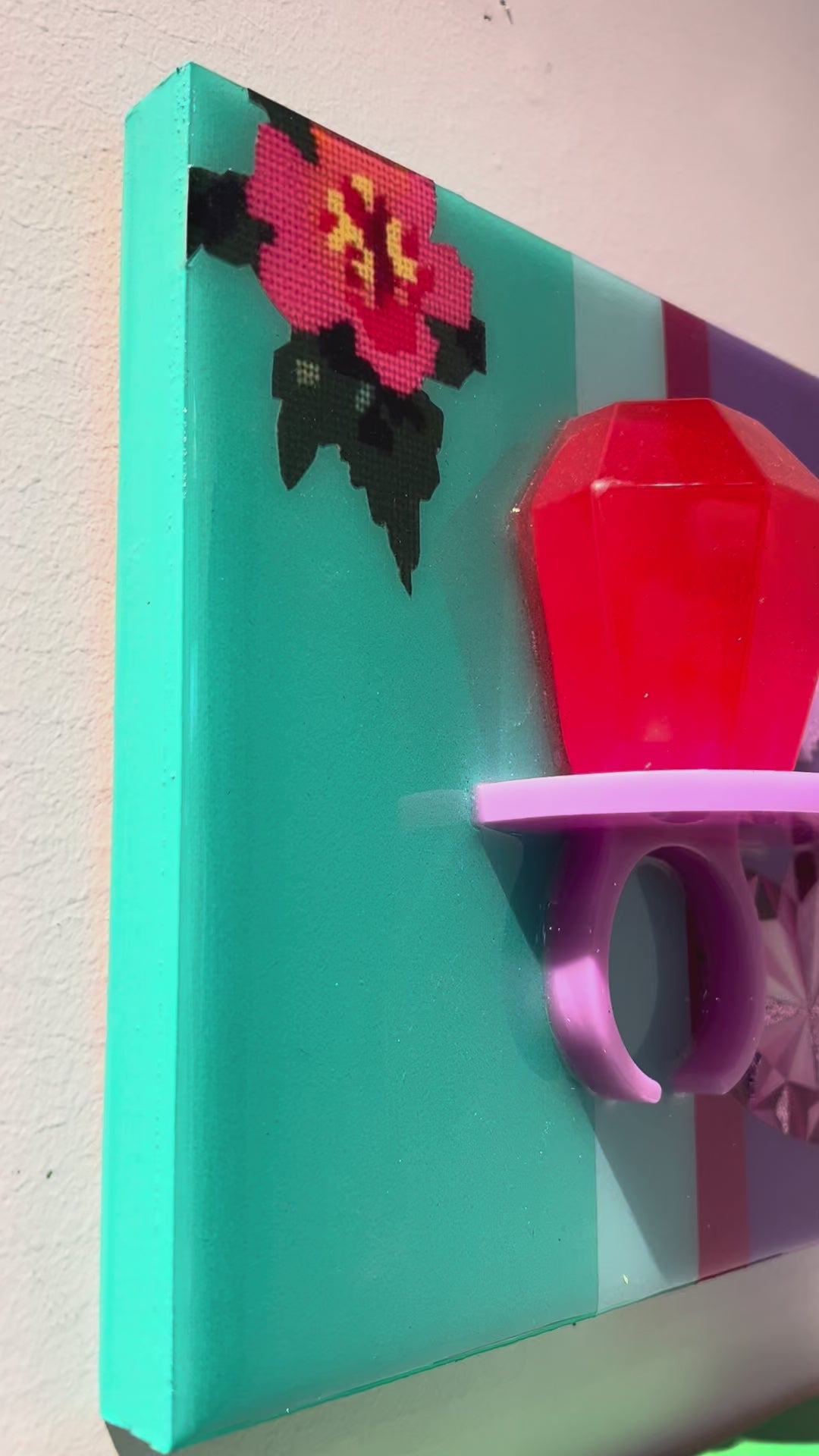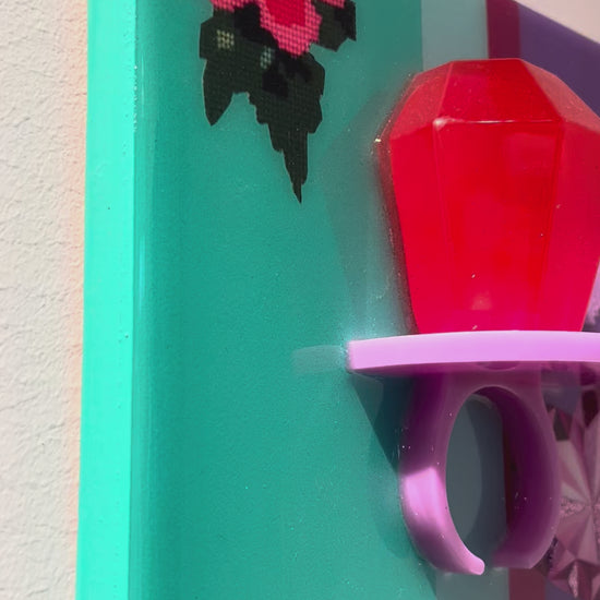 This artwork by Amy Shekhter measures 8 x 8. Amy merges digital design with layers of texture including: resin, glitter, paint, and crystals.