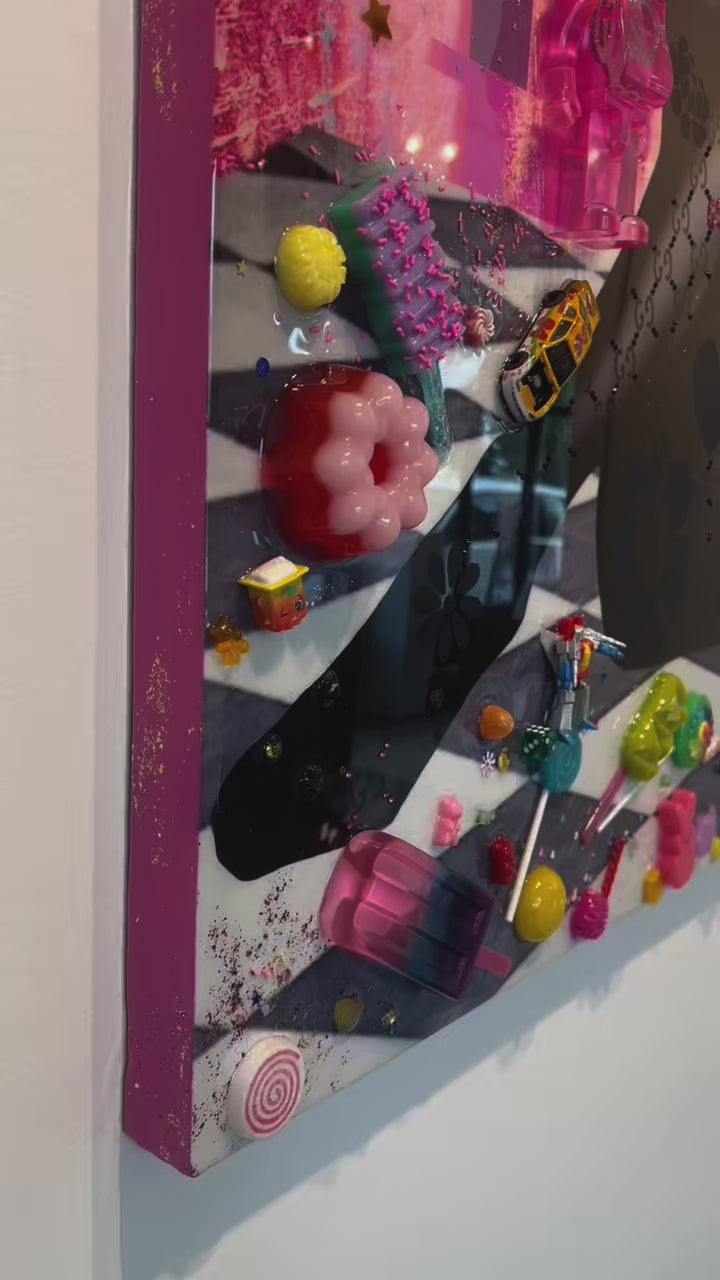 This artwork by Amy Shekhter measures 50 x 40. Amy merges digital design with layers of texture including: resin, glitter, paint, and crystals.