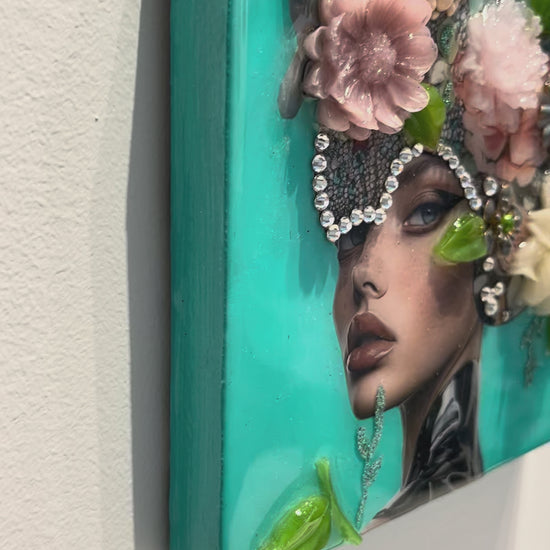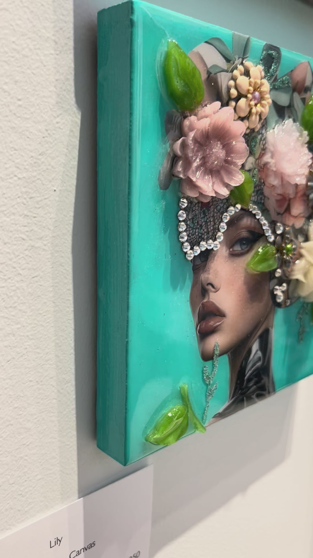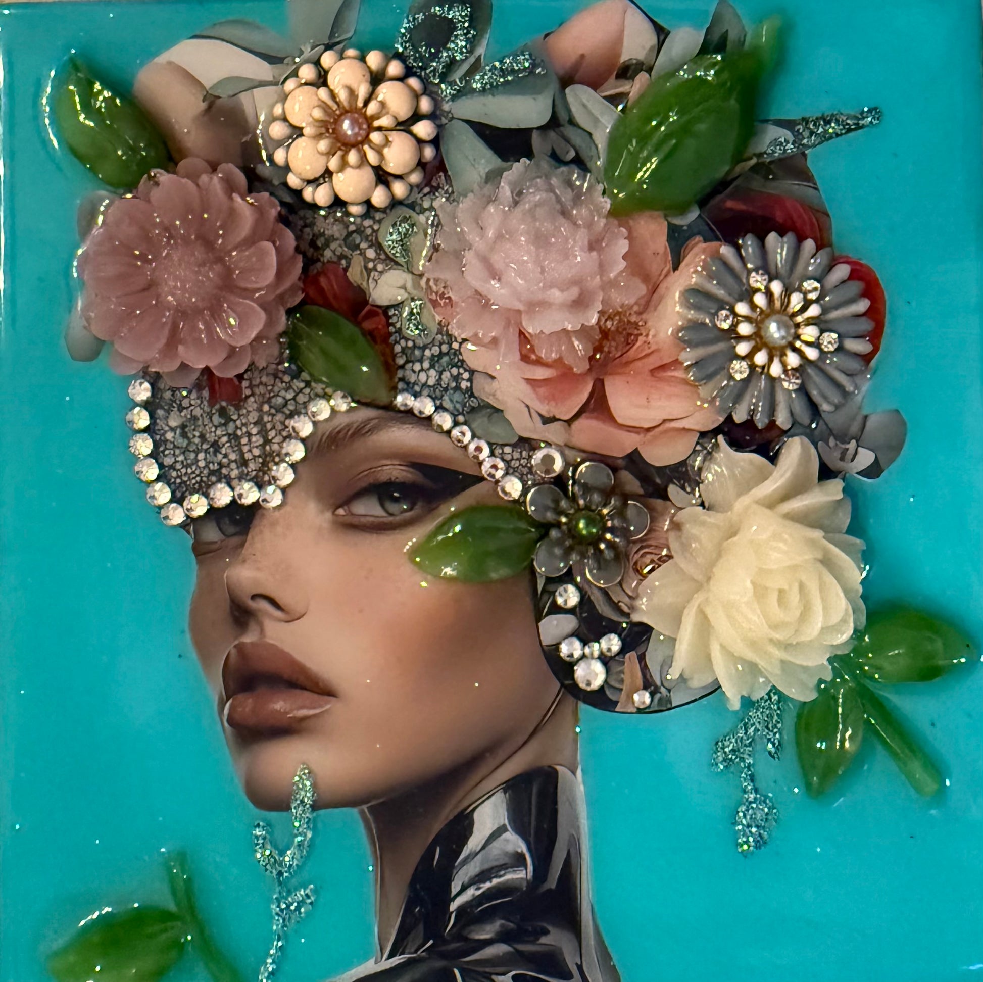 This artwork by Amy Shekhter measures 6" x 6". Amy merges digital design with layers of texture including: resin, glitter, paint, and crystals.