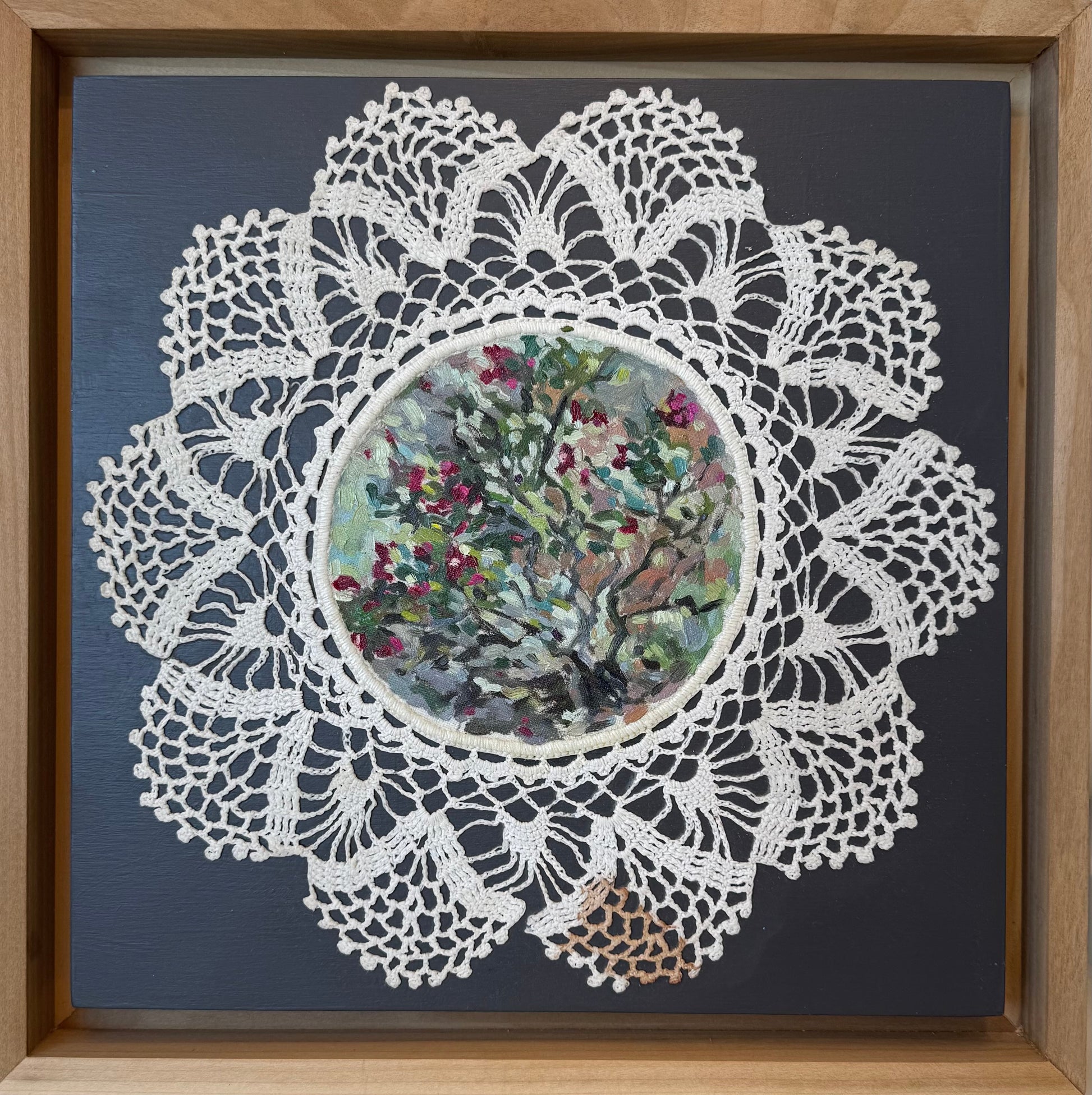 This Mixed Media Painting by Michelle Berg Radford is 30 x 30. This work is painted on a vintage doily.