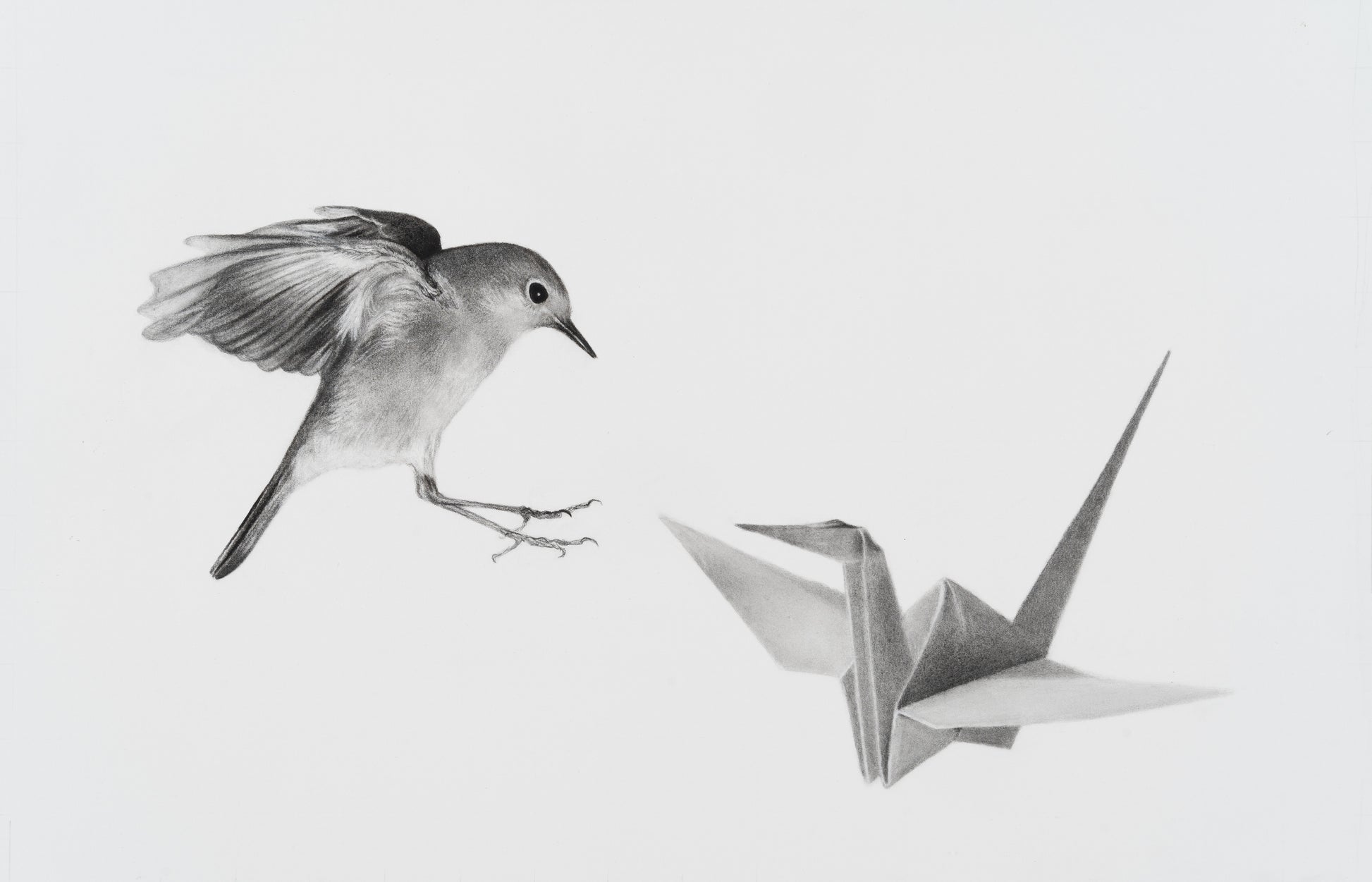 This charcoal and graphite drawing on Stonehenge paper by Traci Wright Martin is 12 x 18. A delicate, contemplative drawing that contrasts the realism of a small bird mid-flight with the precise geometry of an origami crane. Traci Wright Martin’s refined use of charcoal and graphite creates striking tonal depth while exploring themes of nature, artifice, and perception.