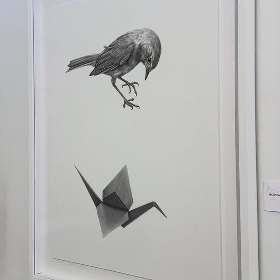 This charcoal and graphite drawing on Stonehenge paper by Traci Wright Martin is 24 x 18. Framed it measures 28 x 22. A delicate, contemplative drawing that contrasts the realism of a small bird mid-flight with the precise geometry of an origami crane. Traci Wright Martin’s refined use of charcoal and graphite creates striking tonal depth while exploring themes of nature, artifice, and perception.