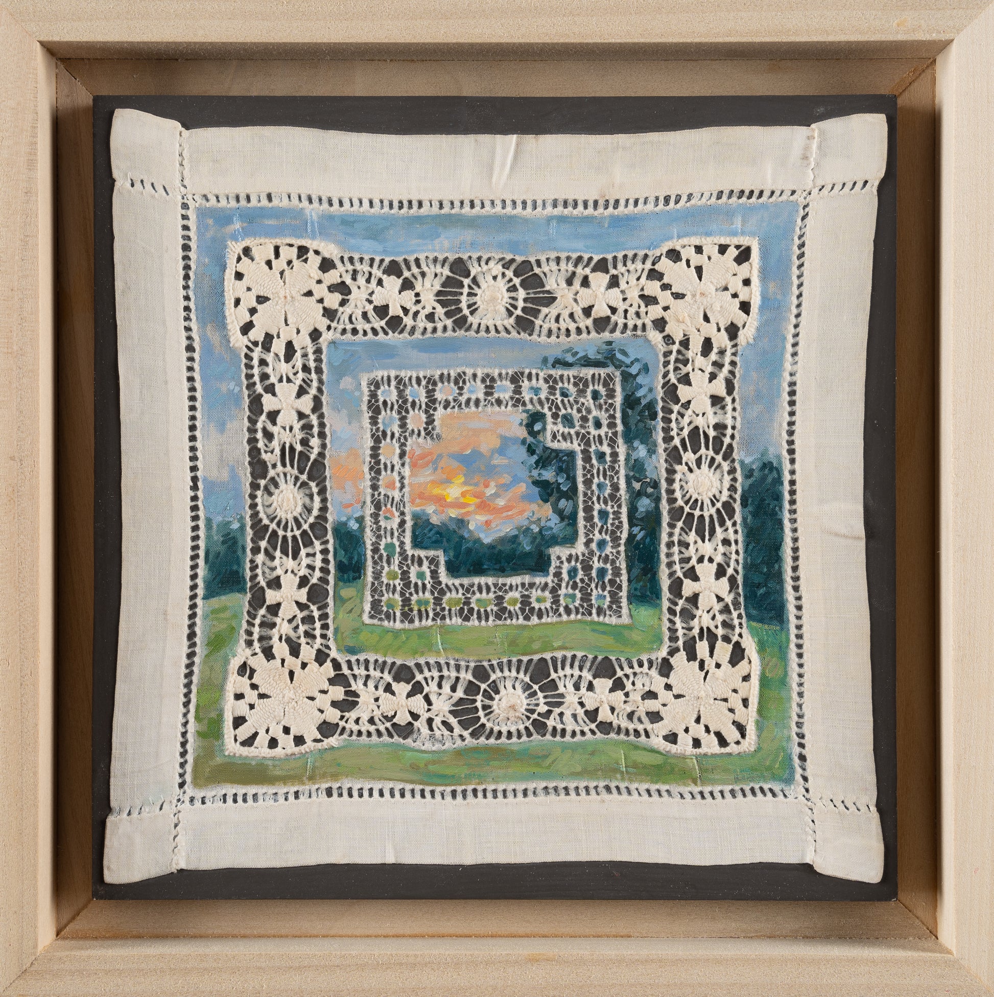 This Mixed Media Painting by Michelle Berg Radford is 9 x 9. This work is painted on a vintage doily.