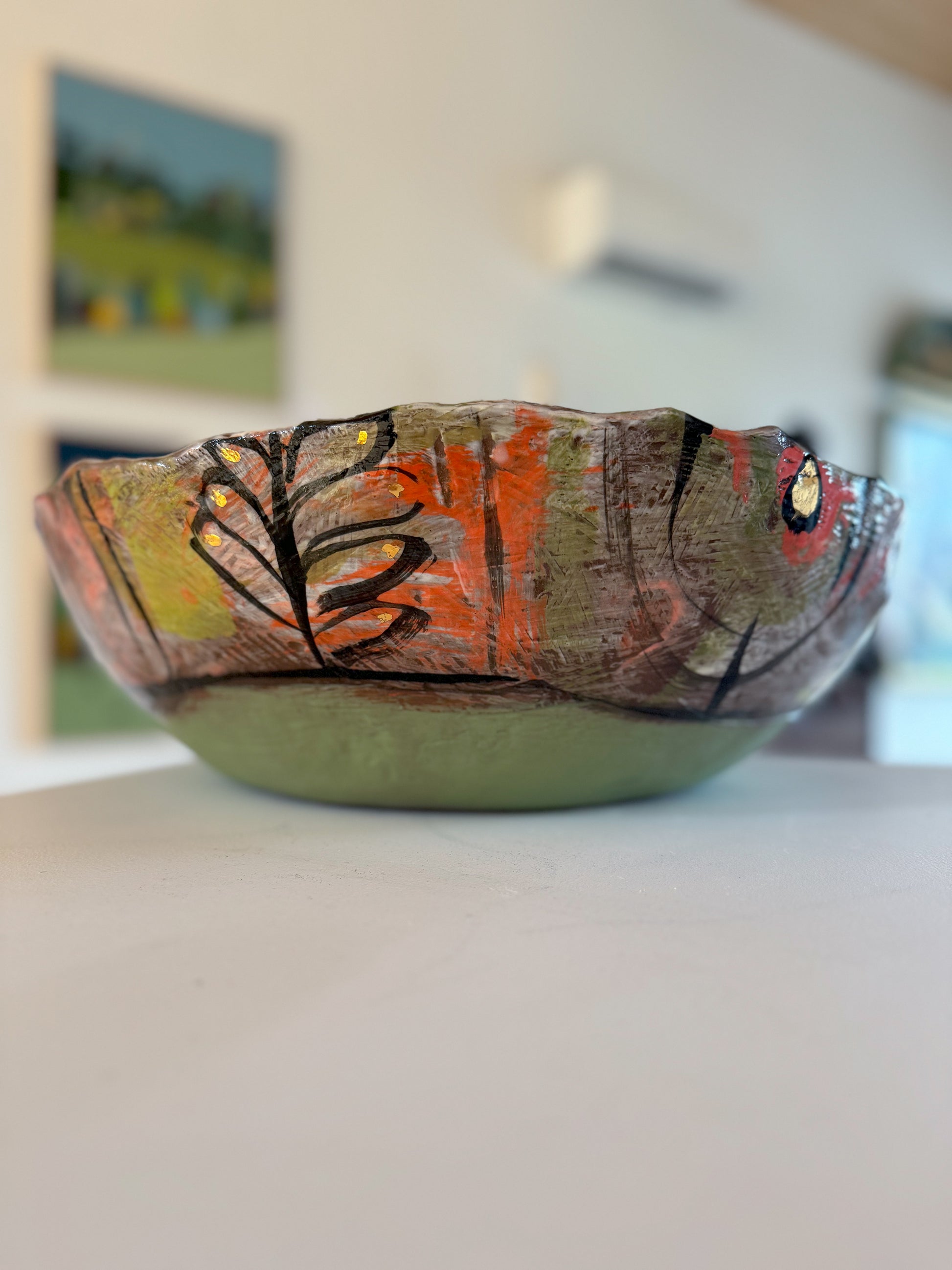 This large thrown serving bowl by Renata Copeland measures 16" in diameter and 5.5" in height. Has has gold luster details. Dishwasher Safe but not microwave safe.