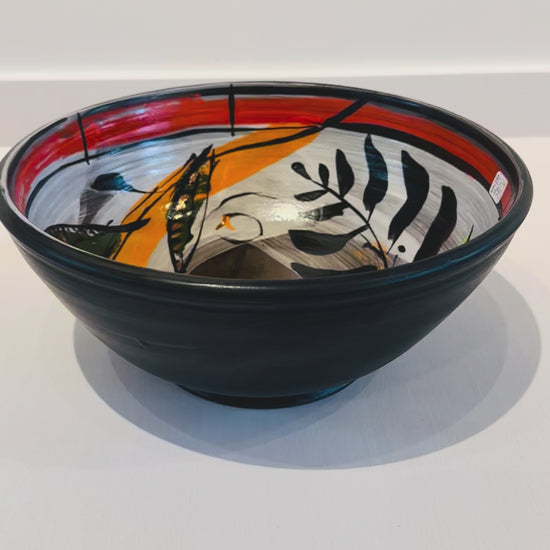 This is a large thrown serving bowl by Renata Copeland. Has gold luster details. Dishwasher and Food Safe, but not Microwave Safe.