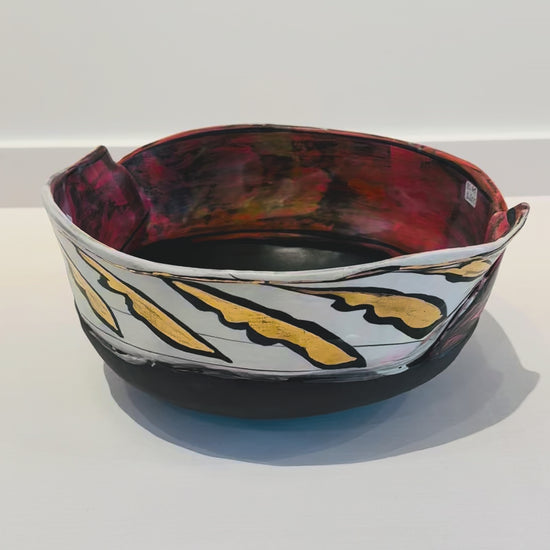 This is a large thrown serving bowl by Renata Copeland. Has gold luster details. Dishwasher and Food Safe but not Microwave Safe.