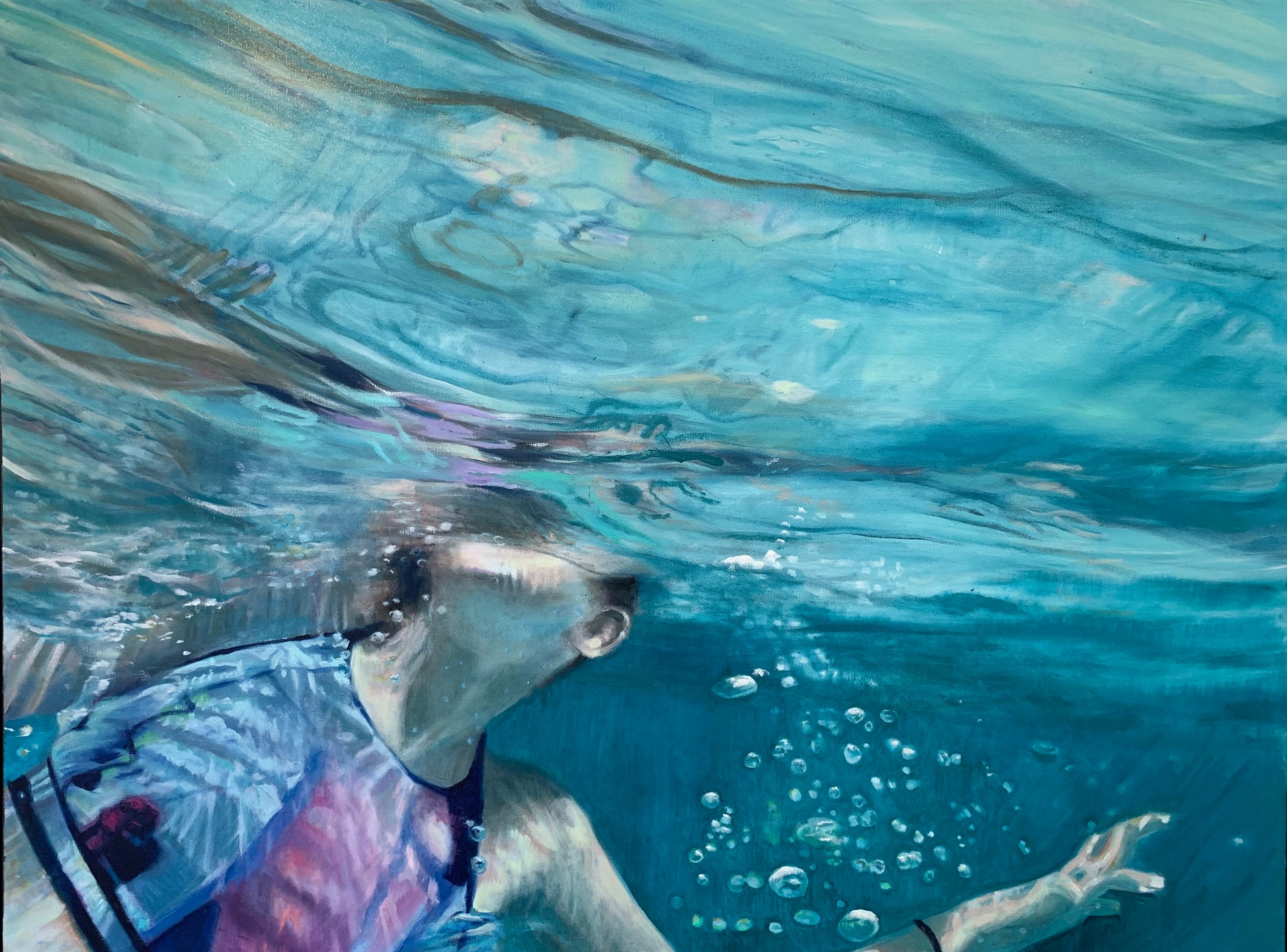 "Side Swimmer" by Annie Flynn measures 30 x 40. Annie uses traditional painting techniques on canvas to create her layered and striking figurative work.
