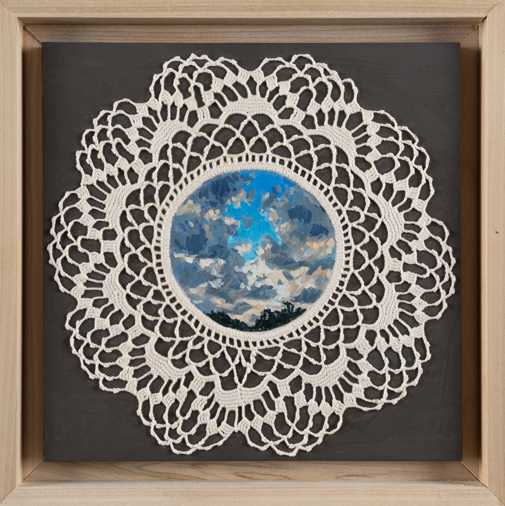 This Mixed Media Painting by Michelle Berg Radford is 11 x 11. This work is painted on a vintage doily.