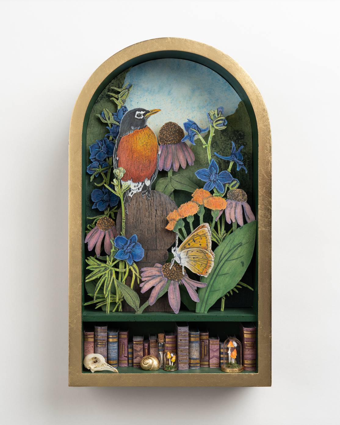 "My work is an exploration of the natural world. I use scraps of wood, paper, bone, and fabric and include both found and crafted specimens. Each art piece contains a variety of processes including collagraph printmaking, woodworking, and sculpting. There is a certain practicality and reflection to my work. I work with things that have died, but left a beautiful reminder of their existence (skulls, vertebrae, fossils, and insects). I am inspired by the sense of discovery of 18th and19th century natural history collections, and the preservation of reliquaries housed in the great cathedrals. As they do, my art invites a closer study of the earth around us." Bess