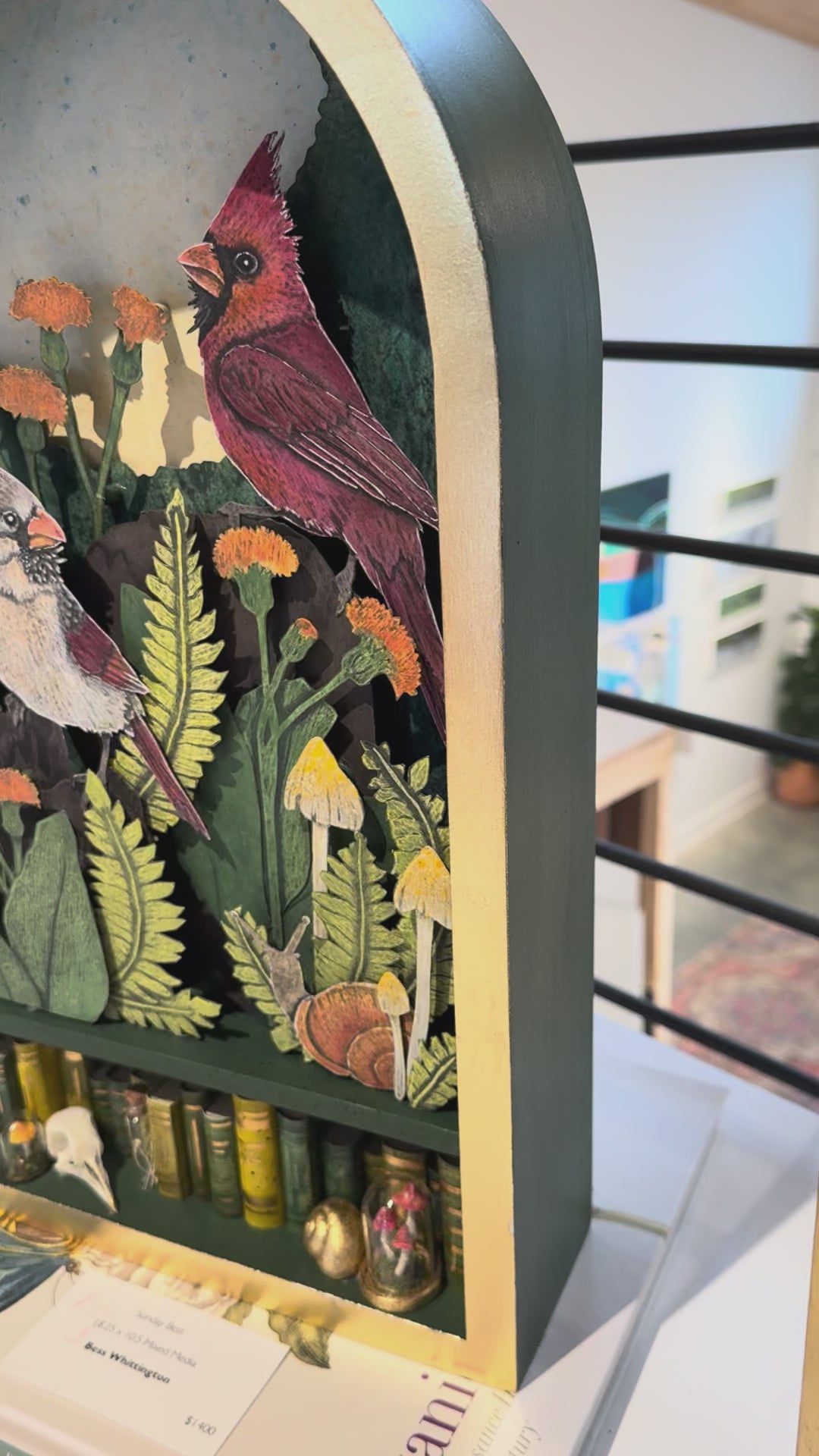 "My work is an exploration of the natural world. I use scraps of wood, paper, bone, and fabric and include both found and crafted specimens. Each art piece contains a variety of processes including collagraph printmaking, woodworking, and sculpting. There is a certain practicality and reflection to my work. I work with things that have died, but left a beautiful reminder of their existence (skulls, vertebrae, fossils, and insects). I am inspired by the sense of discovery of 18th and19th century natural history collections, and the preservation of reliquaries housed in the great cathedrals. As they do, my art invites a closer study of the earth around us." Bess