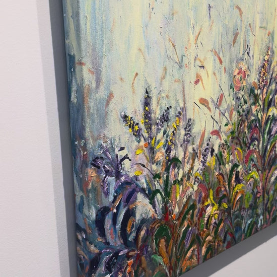 This mixed media painting by Pavni measures 24"x 48", and is in a natural wood framed. Her work depicts dense garden foliage using loose brushwork and a vibrant palette of greens, blues, purples, and warm earth tones.