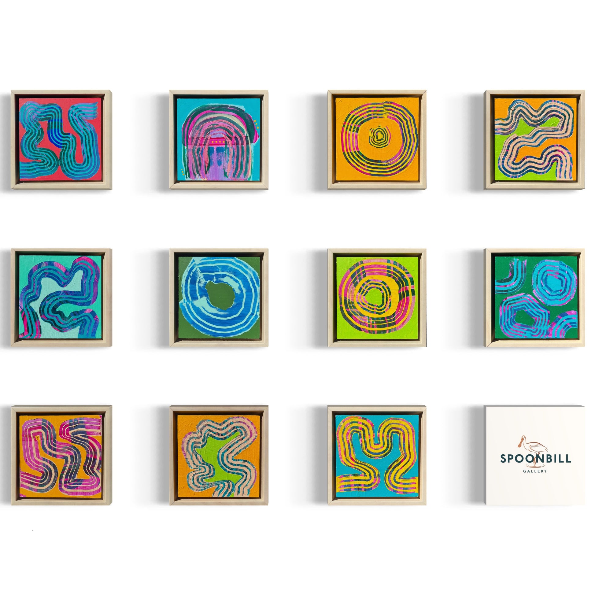This painting by Sunny Mullarkey measures 6.5. x 6.5 x 1.5 . This work is acrylic on wood and is framed.