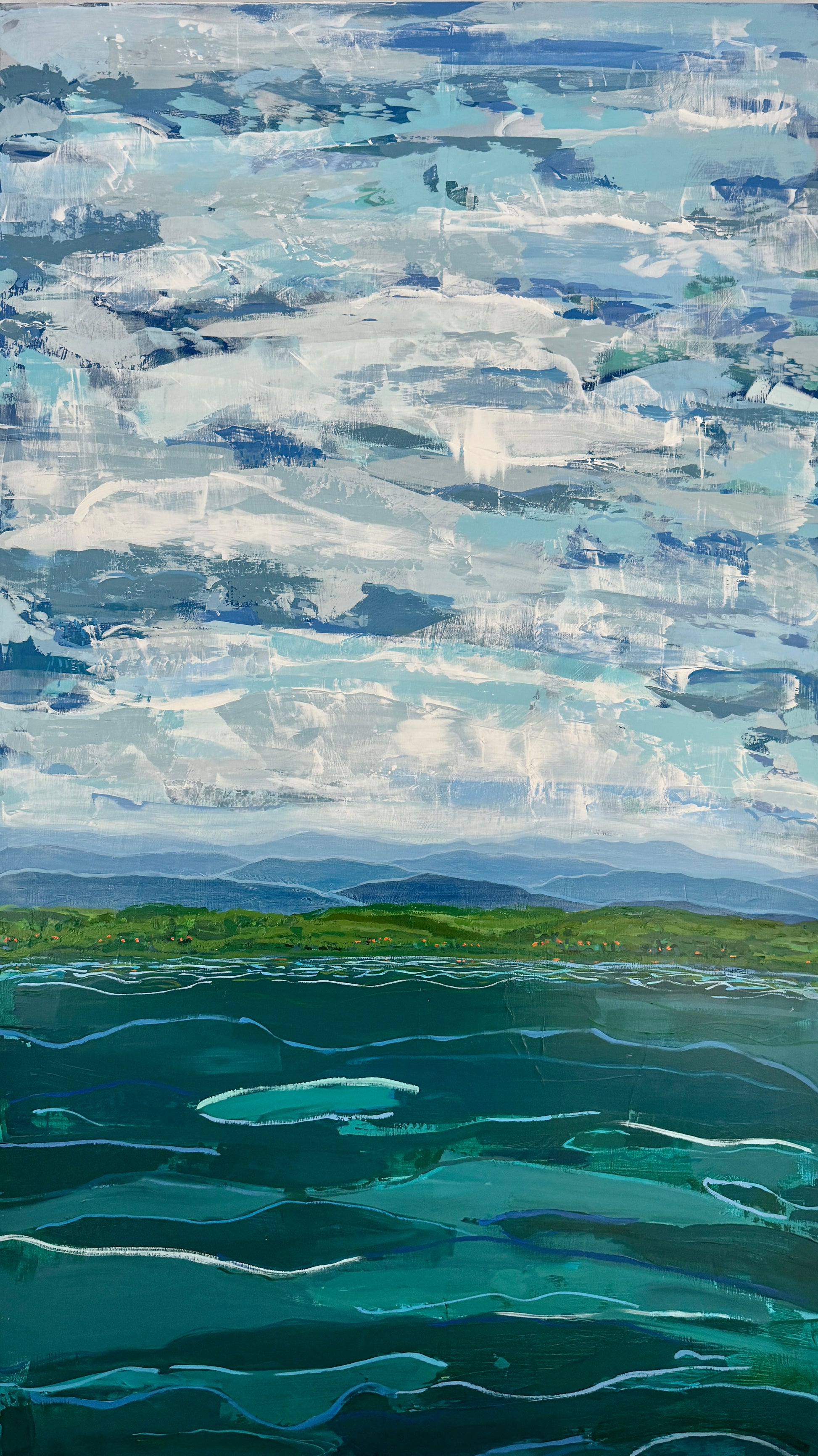 This Painting by Moni Hill is 40 x 70. Moni Hill is inspired by the natural world and uses acrylic paint layered upon wood in her work. This collection is a celebration of resilience and beauty of the mountain lakes of the southeast region.