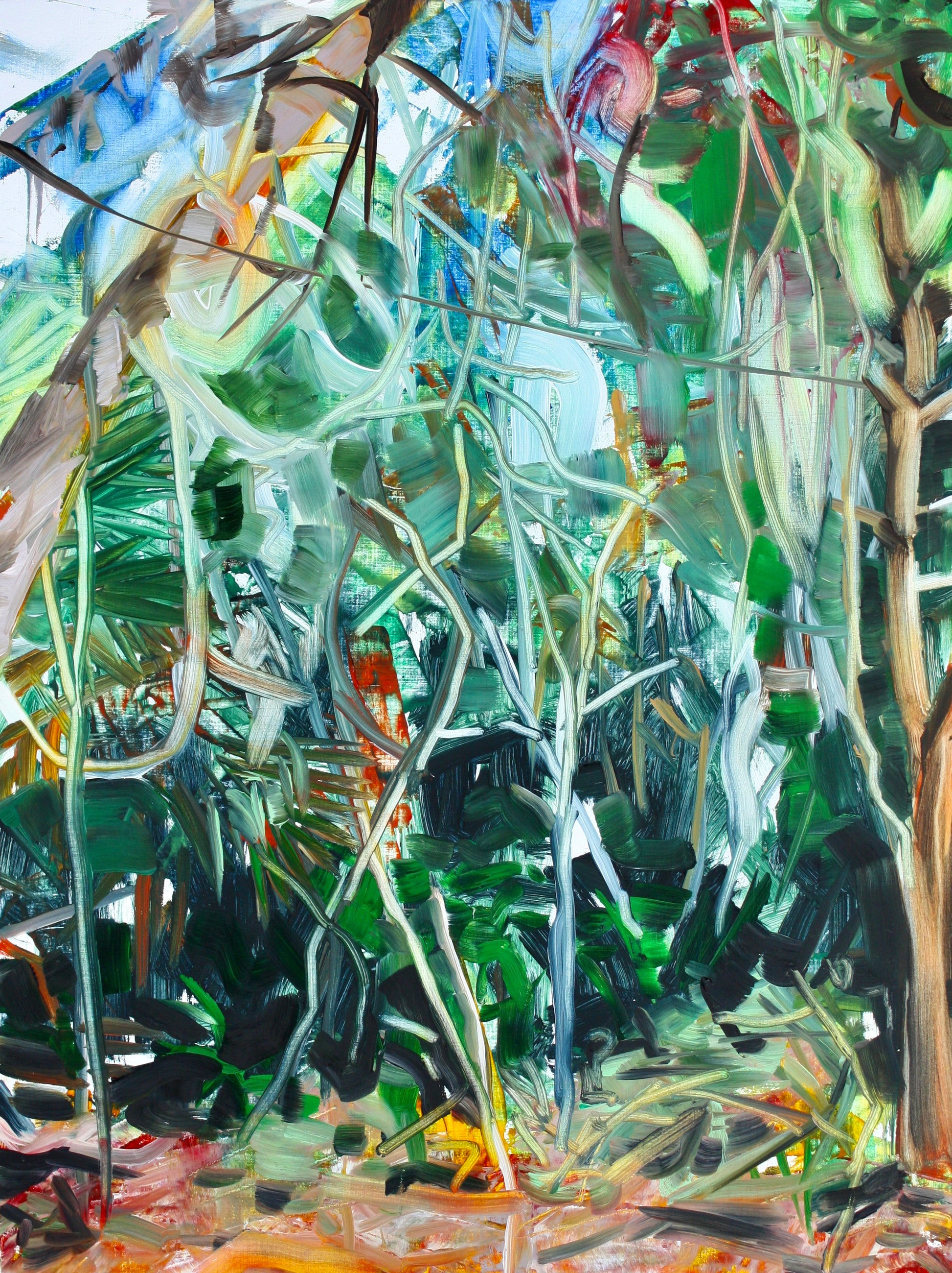 This 10 x 10 oil on panel painting by Laura Colomb features a vivid, layered brushstroke style that merges abstract shapes with rich, natural hues. Energetic swirls of pigment create depth and movement, capturing the lush essence of foliage and undergrowth.