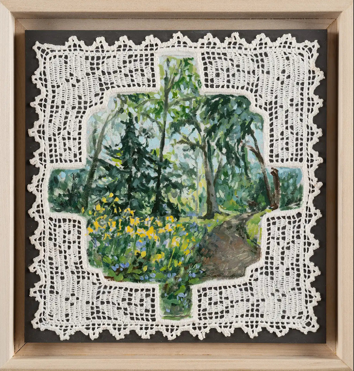 This Mixed Media Painting by Michelle Berg Radford is 12 x 11.5. This landscape is based on scenery on Addison's Walk in Oxford, England. This work is painted on a vintage doily.