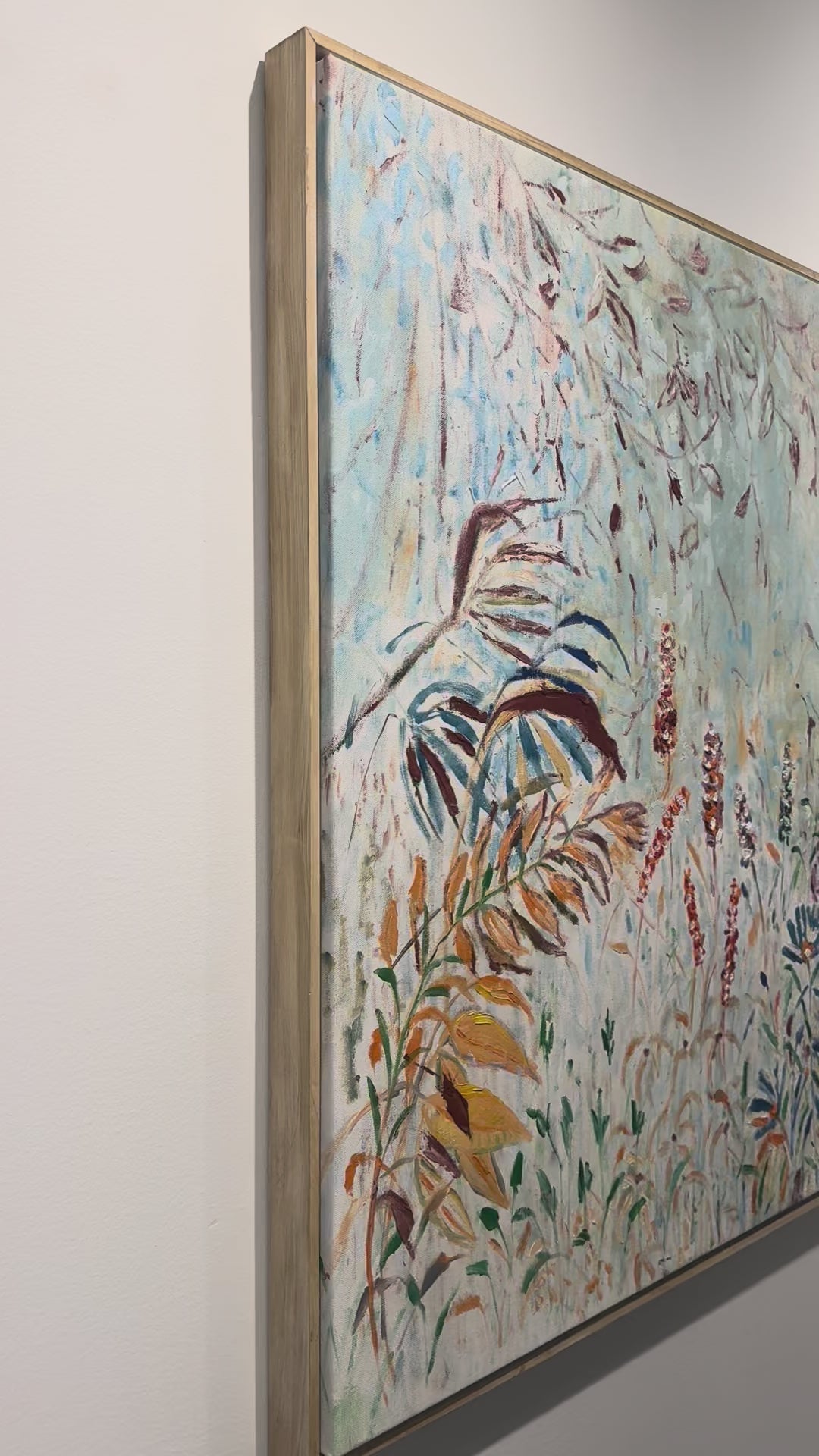 This mixed media painting by Pavni measures 36"x 48", and is in a natural wood framed. Her work depicts dense garden foliage using loose brushwork and a vibrant palette of greens, blues, purples, and warm earth tones.