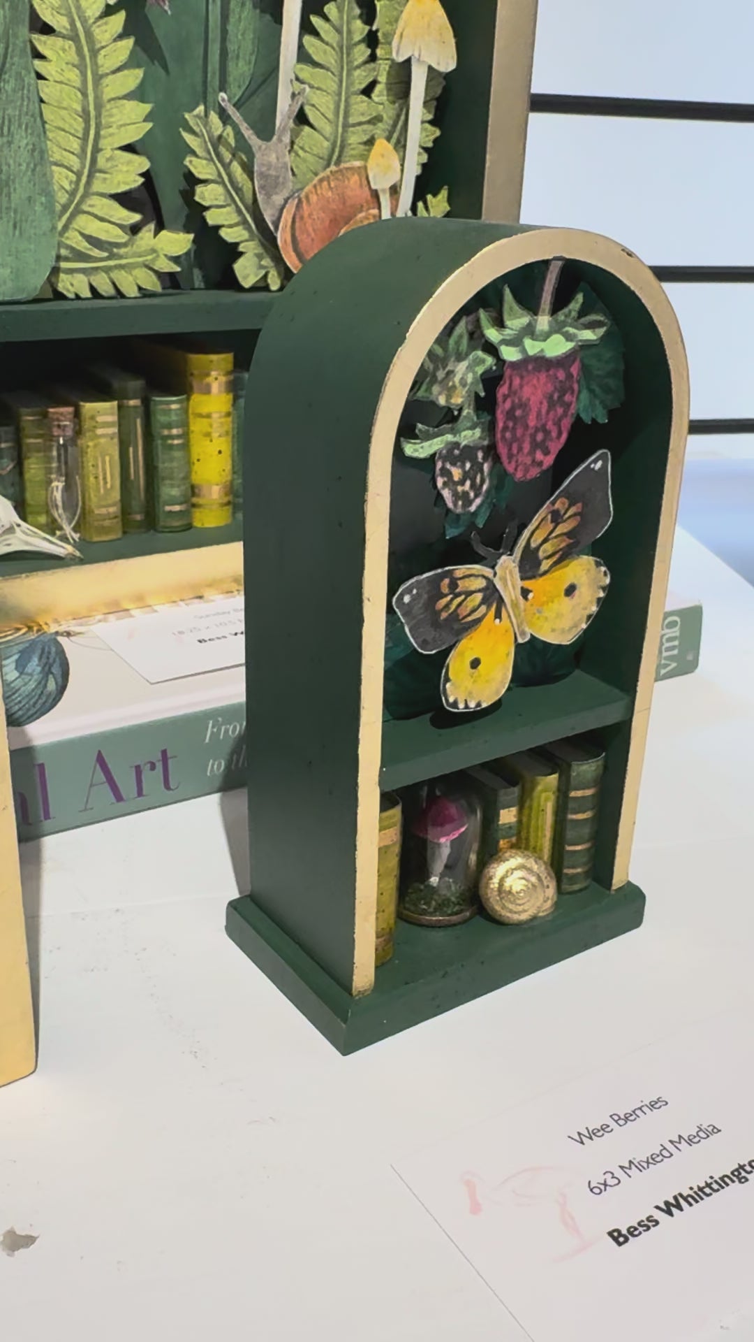 This mixed media piece by Bess Whittington measures 6 x 3. It is in a hand made arched wood cabinet.