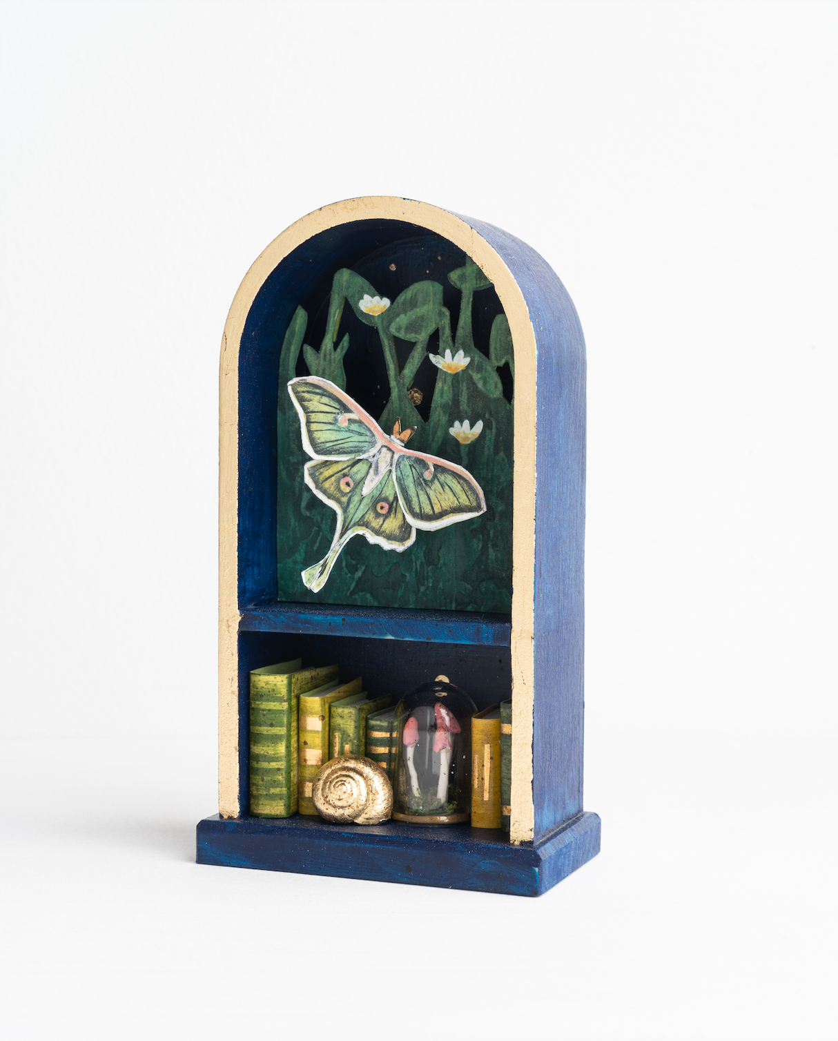 "My work is an exploration of the natural world. I use scraps of wood, paper, bone, and fabric and include both found and crafted specimens. Each art piece contains a variety of processes including collagraph printmaking, woodworking, and sculpting. There is a certain practicality and reflection to my work. I work with things that have died, but left a beautiful reminder of their existence (skulls, vertebrae, fossils, and insects). I am inspired by the sense of discovery of 18th and19th century natural history collections, and the preservation of reliquaries housed in the great cathedrals. As they do, my art invites a closer study of the earth around us." Bess