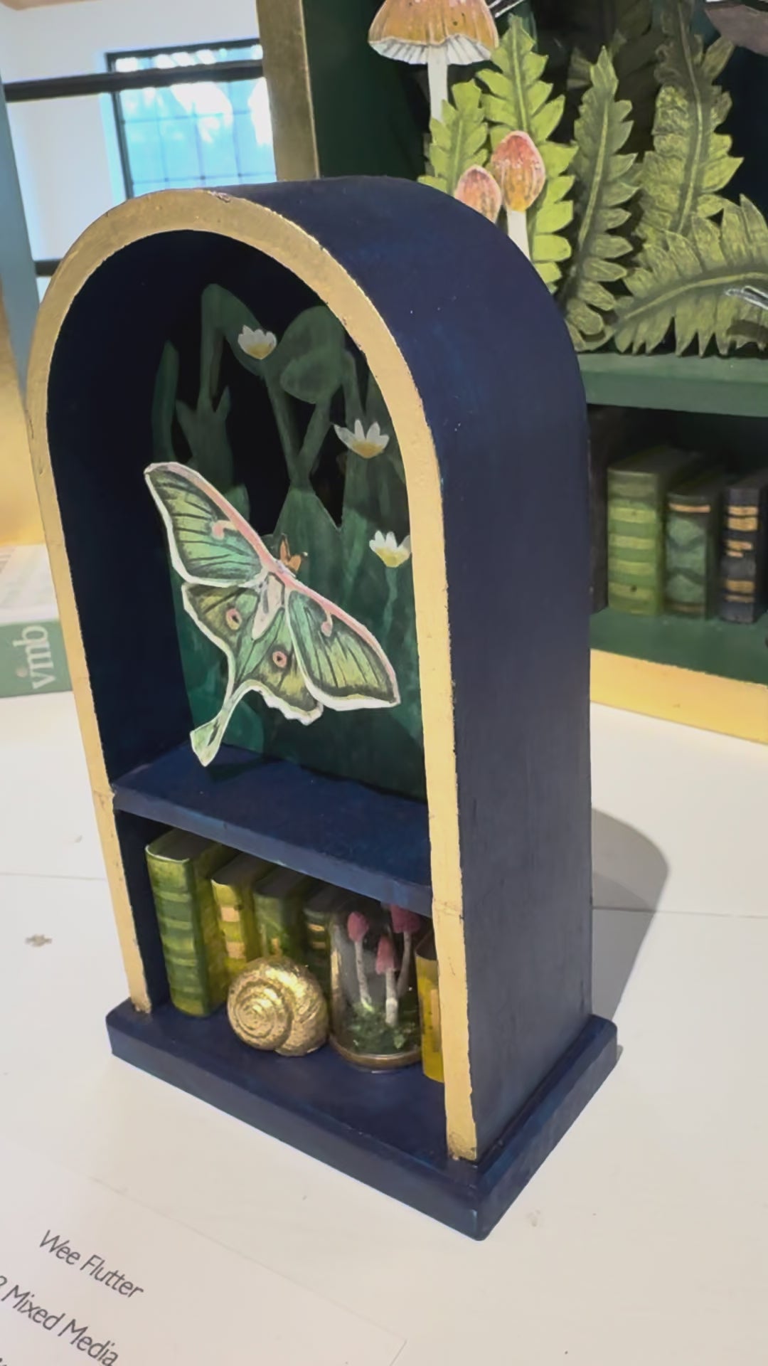This mixed media piece by Bess Whittington measures 6 x 3. It is in a hand made arched wood cabinet.