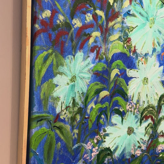 This mixed media painting by Pavni measures 48"x 60", and is in a natural wood framed. Her work depicts dense garden foliage using loose brushwork and a vibrant palette of greens, blues, purples, and warm earth tones.