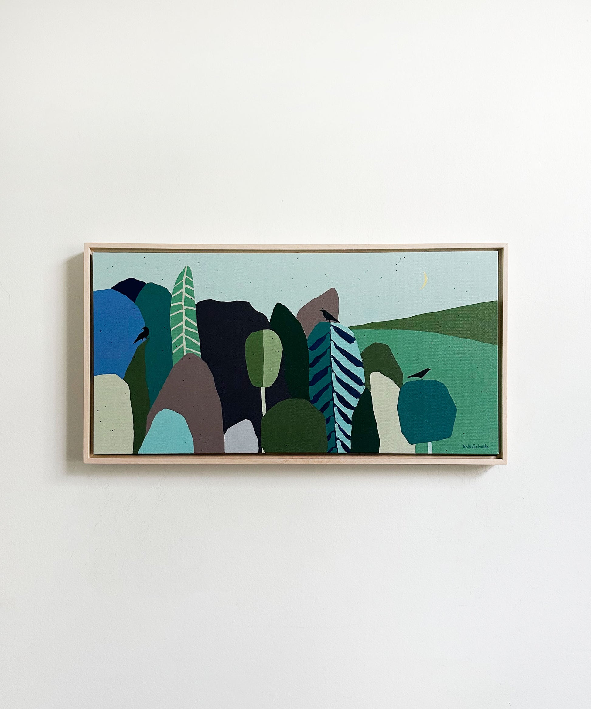 This artwork by Kate Schultz measures 12 x 24. Kate uses acrylic paint on canvas and this work is in a maple floater frame.