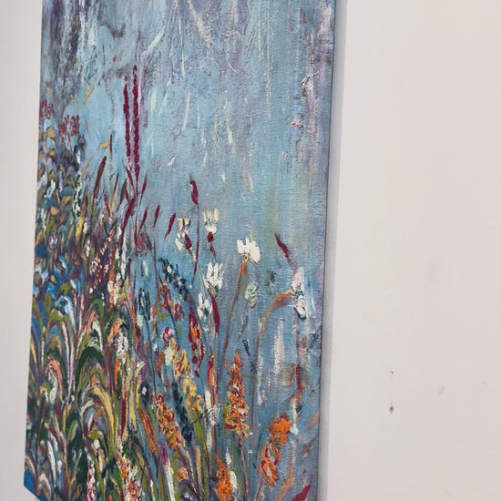 This mixed media painting by Pavni measures 36"x 24", and is in a natural wood framed. Her work depicts dense garden foliage using loose brushwork and a vibrant palette of greens, blues, purples, and warm earth tones.
