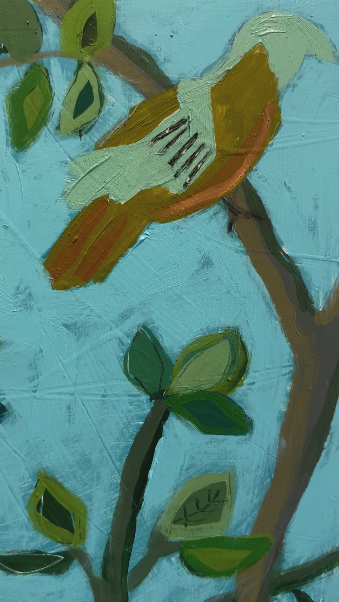 This Painting by Berkley Wooten is 24 x 30. Berkley uses acrylic and ink and uses palette knives, brushes, tools, and fingers to scratch and manipulate the wood panels.