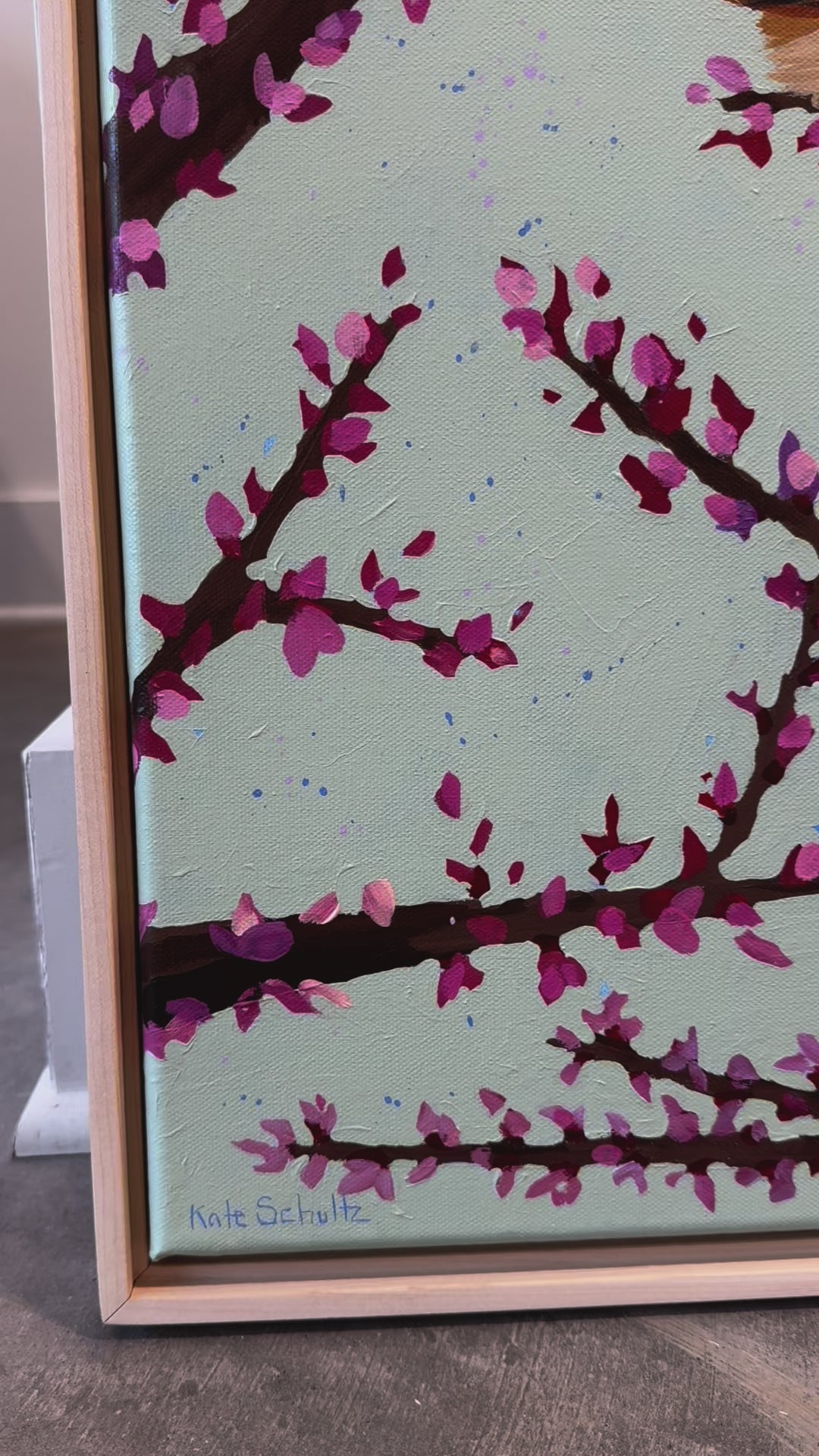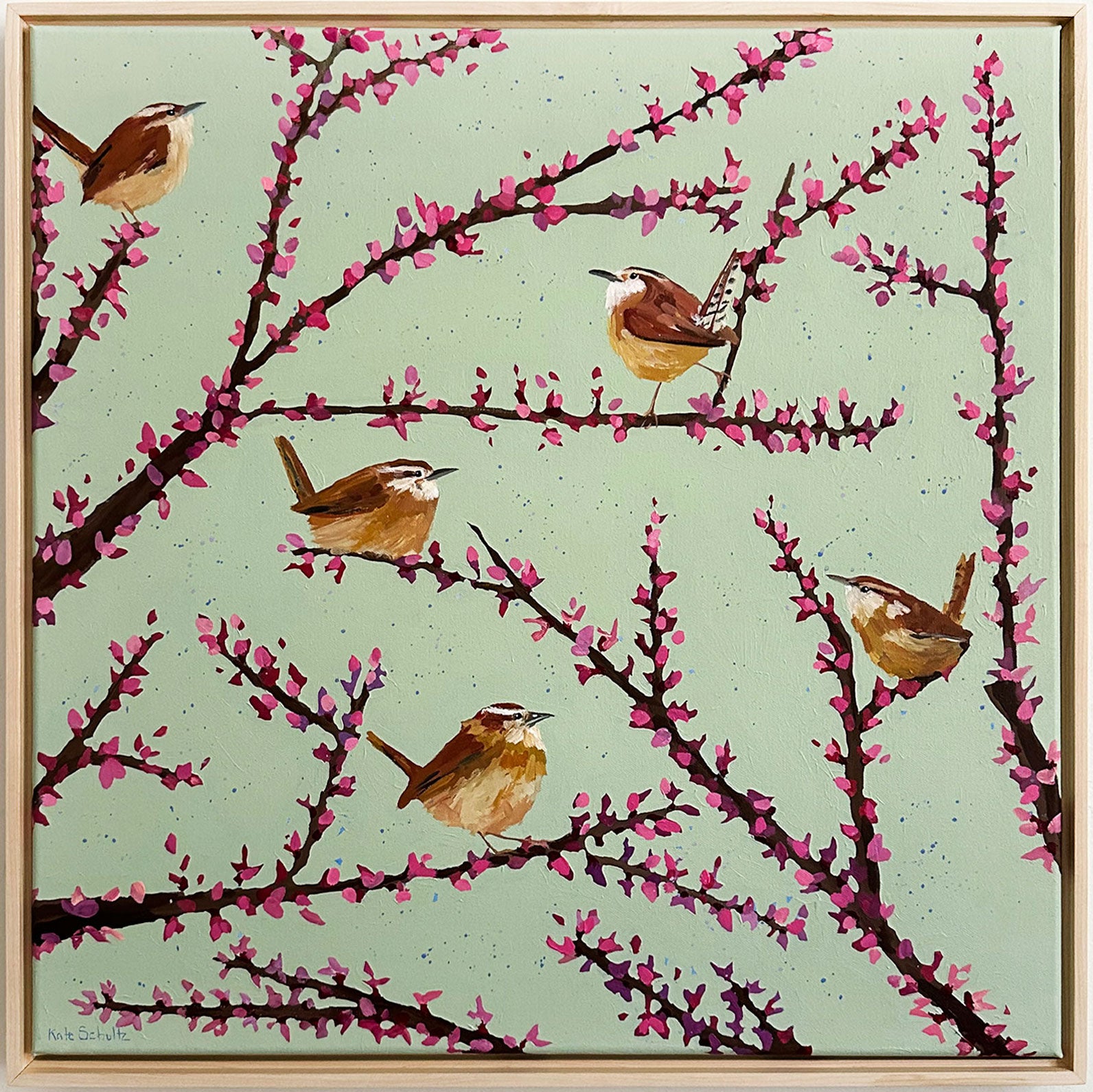 This artwork by Kate Schultz measures 24 x 24. Kate uses acrylic paint on canvas and this work is in a maple floater frame.