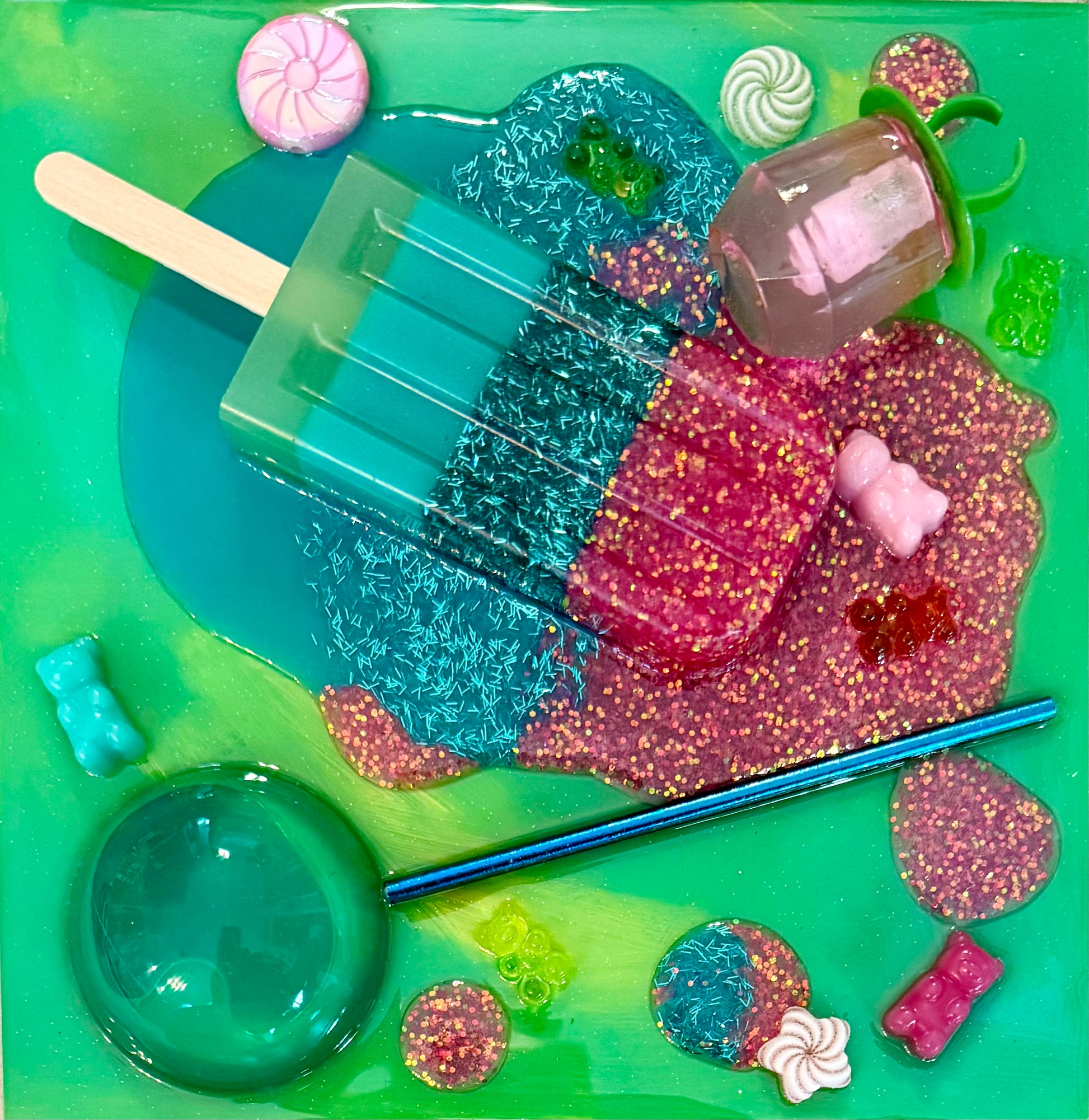 This artwork by Amy Shekhter measures 8" x 8". Amy merges digital design with layers of texture including: resin, glitter, paint, and crystals.