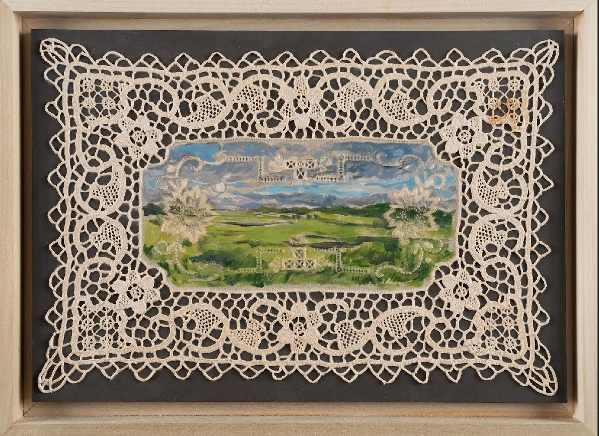 This Mixed Media Painting by Michelle Berg Radford is 12 x 17. This landscape is based on scenery from her travels. This work is painted on a vintage doily.